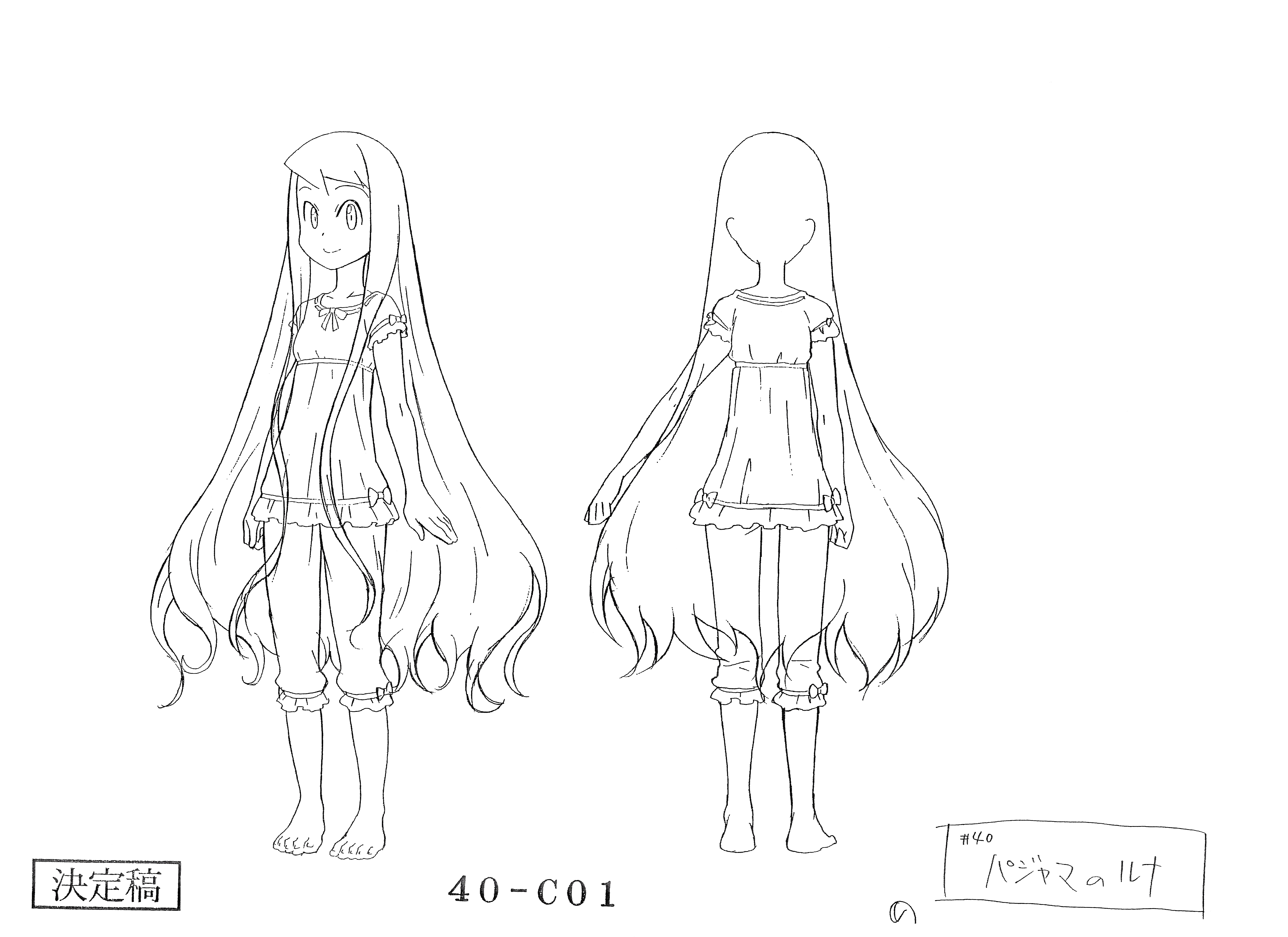 1girl absurdres hair_down highres lineart long_hair looking_at_viewer luna_platz_(mega_man) mega_man_(series) mega_man_star_force_(series) multiple_views official_art production_art simple_background sleepwear smile third-party_source very_long_hair white_background