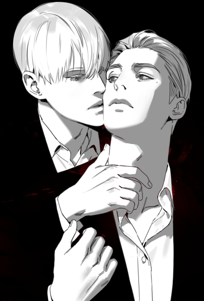 2boys behind_another blending collared_shirt commentary_request copyright_request downturned_eyes greyscale_with_colored_background hair_over_one_eye hair_slicked_back hand_on_another's_neck korean_commentary lips looking_at_another looking_to_the_side male_focus mmm1597 mole mole_under_eye multiple_boys nose parted_lips shirt short_hair yaoi