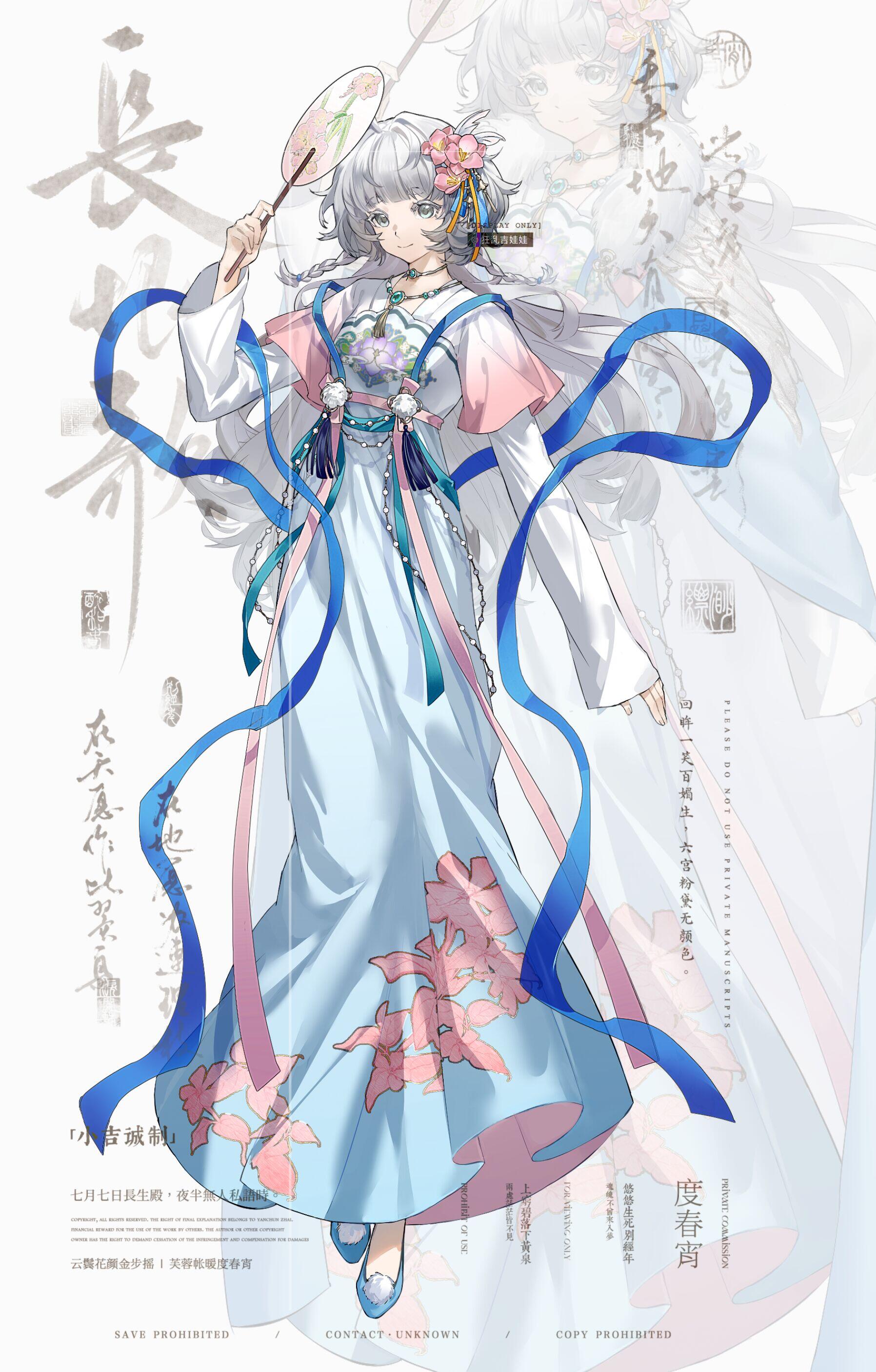 1girl absurdres artist_name bad_source blunt_bangs braid chinese_clothes chinese_text dress english_text flower full_body grey_eyes grey_hair hair_flower hair_ornament hand_fan hanfu heziqun highres holding holding_fan jewelry kuangluan_jiwawa long_hair long_sleeves looking_at_viewer mixed-language_text original paper_fan ribbon shawl smile solo standing tanling_ruqun tuanshan twin_braids white_background