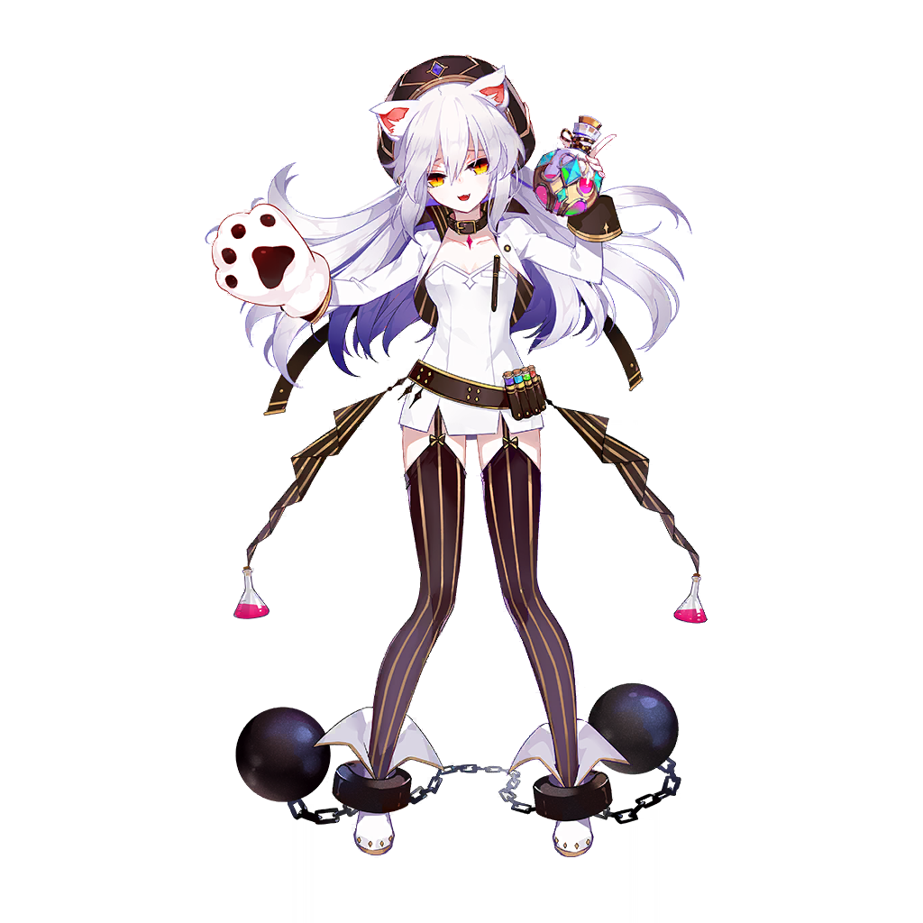 1girl animal_ears animal_hands ball_and_chain_restraint belt benghuai_xueyuan black_thighhighs cat_ears cat_paws collar cuffs dress full_body gloves hat holding honkai_(series) jacket long_hair official_art open_clothes open_jacket open_mouth shackles shoes single_glove solo tania_(benghuai_xueyuan) thighhighs transparent_background vial white_dress white_hair white_jacket white_shoes yellow_eyes