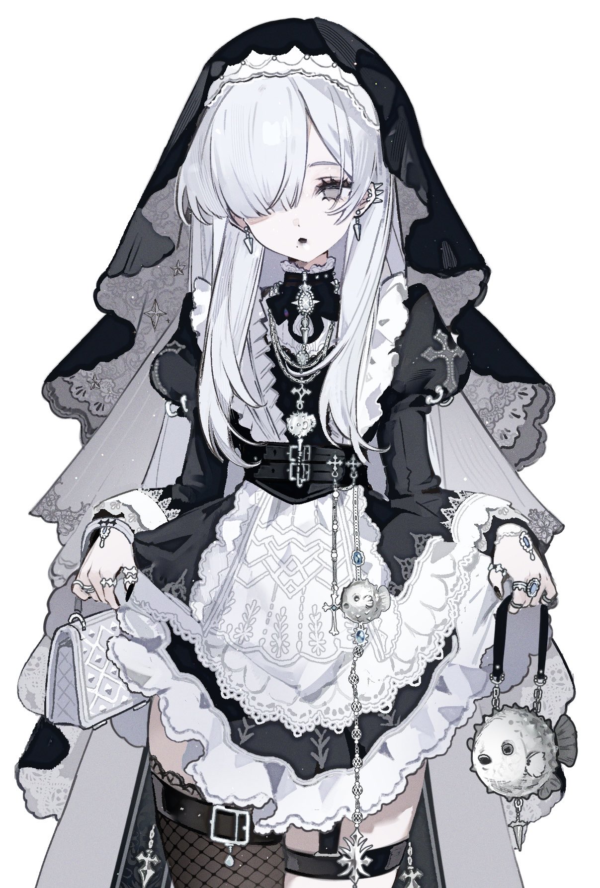 1girl anomalycollon black_veil clothes_lift commentary dress earrings english_commentary fish fishnet_pantyhose fishnets hair_over_one_eye highres jewelry long_hair nun original pantyhose puffer_fish simple_background skirt skirt_lift solo veil white_background white_dress white_hair