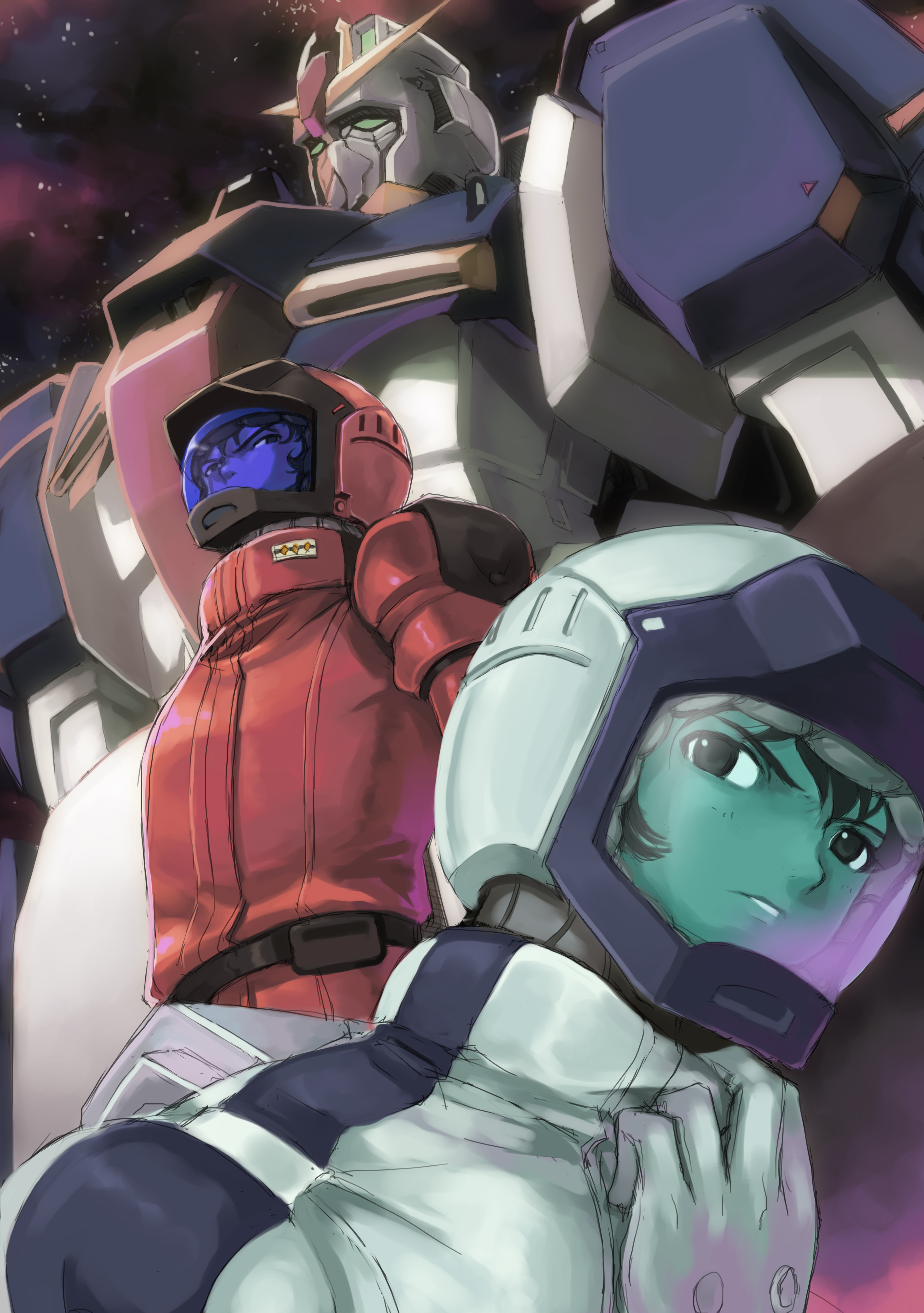 2boys absurdres aeug belt char_aznable gundam highres kamille_bidan mecha mecha_pilot_suit mikazuki_akira! military_rank_insignia mobile_suit multiple_boys nebula quattro_bajeena robot science_fiction space star_(sky) v-fin zeta_gundam zeta_gundam_(mobile_suit)