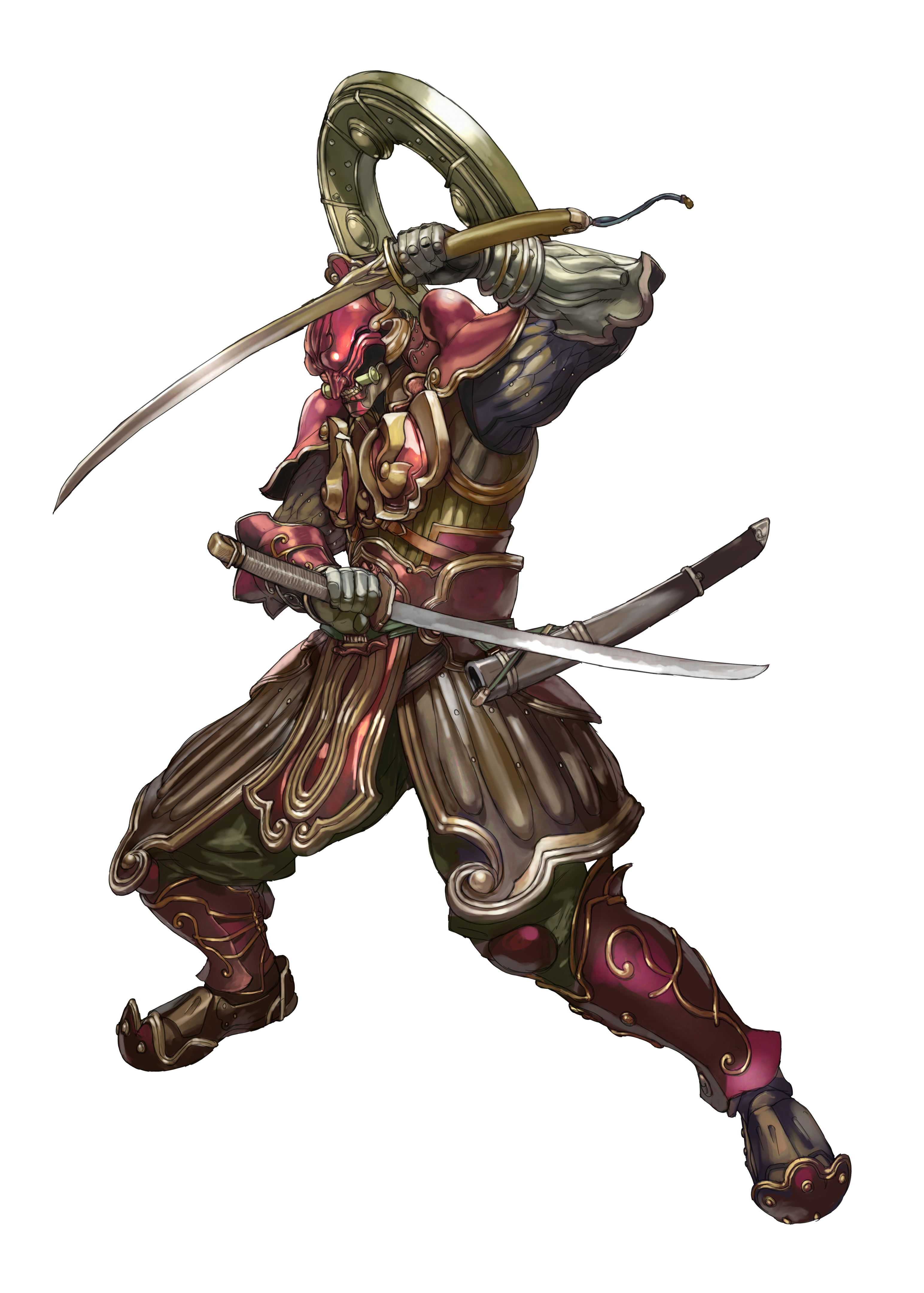 1boy absurdres armor dual_wielding faulds from_side full_armor game_cg gauntlets greaves hakama helmet highres holding holding_sword holding_weapon japanese_clothes katana male_focus mask official_art oni_mask pauldrons shoulder_armor simple_background solo spread_legs sword tachi_(weapon) tekken tekken_tag_tournament_2 unsheathed weapon wheel white_background yamashita_shun'ya yoshimitsu_(namco)