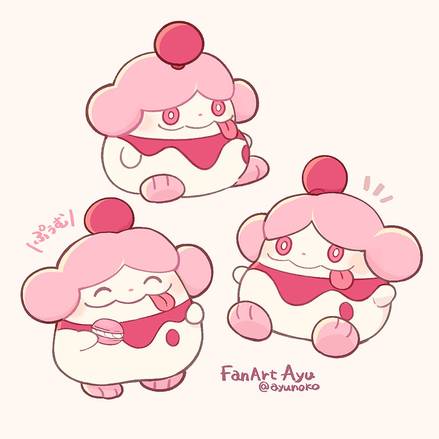 :p ^_^ artist_name ayu_(mog) bright_pupils closed_eyes closed_mouth commentary_request food gen_6_pokemon holding holding_food macaron multiple_views nintendo no_humans notice_lines pink_eyes pokemon pokemon_(creature) pokemon_focus simple_background slurpuff tongue tongue_out twitter_username white_background white_pupils
