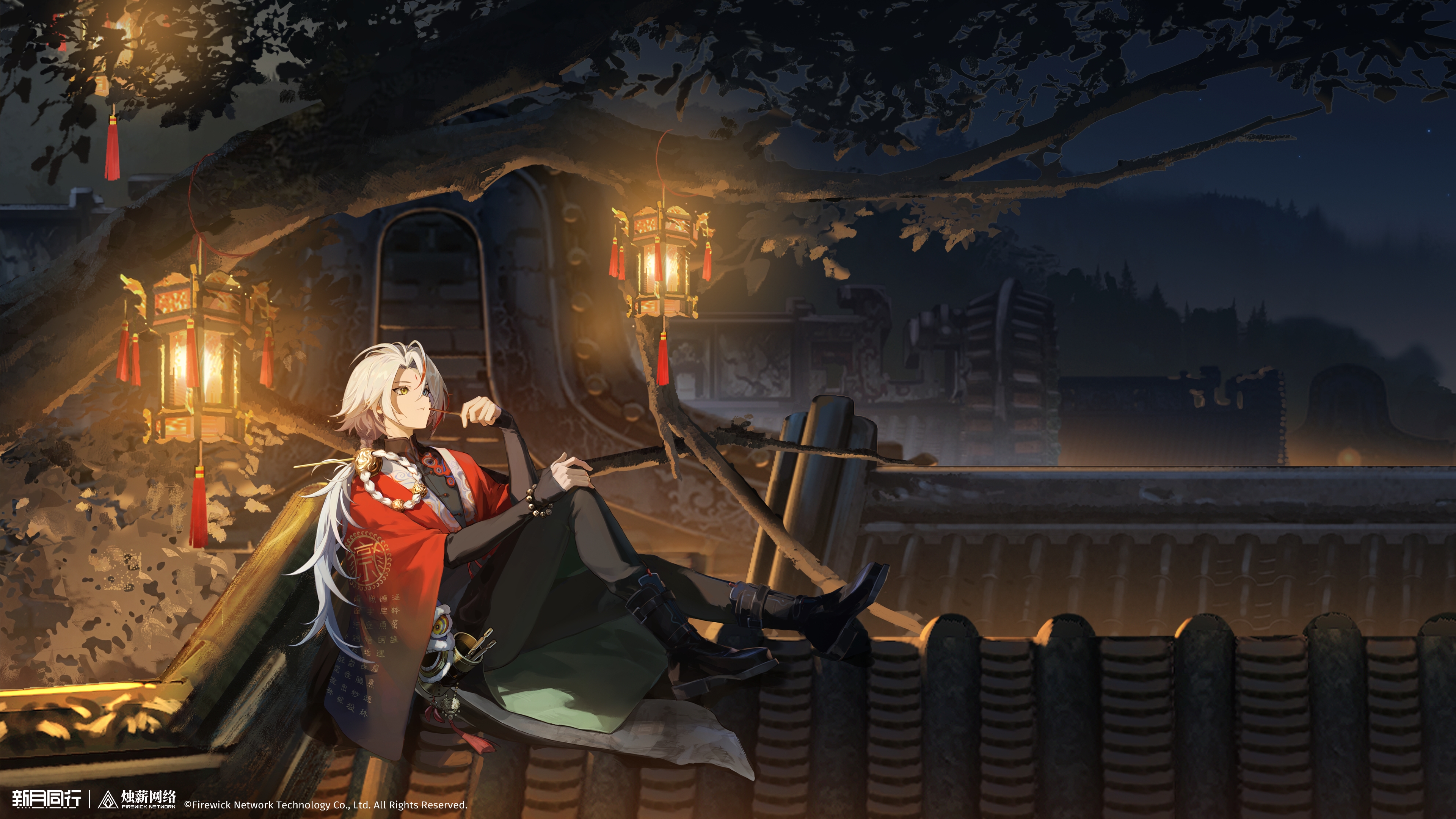 1boy :t absurdres architecture black_boots black_pants black_shirt blue_eyes boots coat copyright_name copyright_notice east_asian_architecture eating facial_mark forehead_mark from_side full_body heterochromia highres holding lantern logo long_hair low_ponytail male_focus night official_art official_wallpaper on_roof outdoors pants ponytail red_coat shirt sitting sitting_on_roof solo tile_roof tree white_hair wutong_(xinyue_tongxing) xinyue_tongxing yellow_eyes