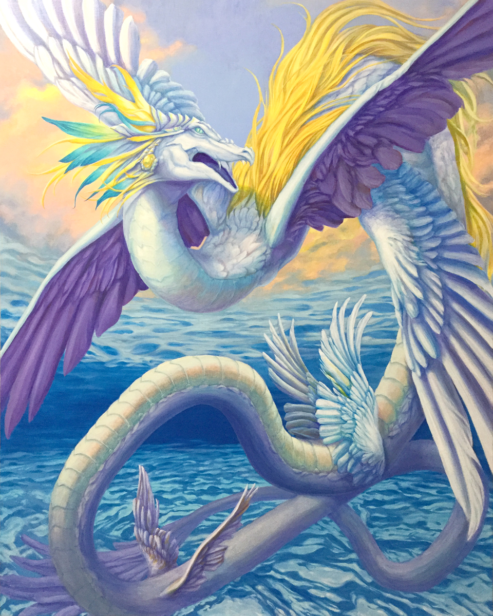acrylic_paint_(medium) animal_focus commentary commentary_request creature dragon eastern_dragon english_commentary flying highres koifumi mixed-language_commentary no_humans original outdoors painting_(medium) sky traditional_media white_dragon