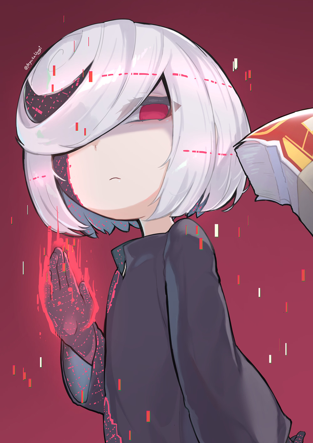 1girl ? artist_name banknote black_dress black_shirt bright_pupils child closed_mouth colored_extremities colored_inner_hair colored_skin commentary commentary_request disgust dollar_bill dotted_background dress from_below glitch glowing glowing_hand hair_between_eyes hair_over_eyes hair_over_one_eye highres humanoid_robot looking_at_viewer money money_gesture multicolored_hair myuutau_tadakichi red_background red_eyes red_hands red_pupils robot robot_girl sage_(sonic) shirt short_hair signature skirt solo sonic_(series) sonic_frontiers spoken_question_mark sweat sweatdrop twitter_username white_hair white_skin wide_sleeves