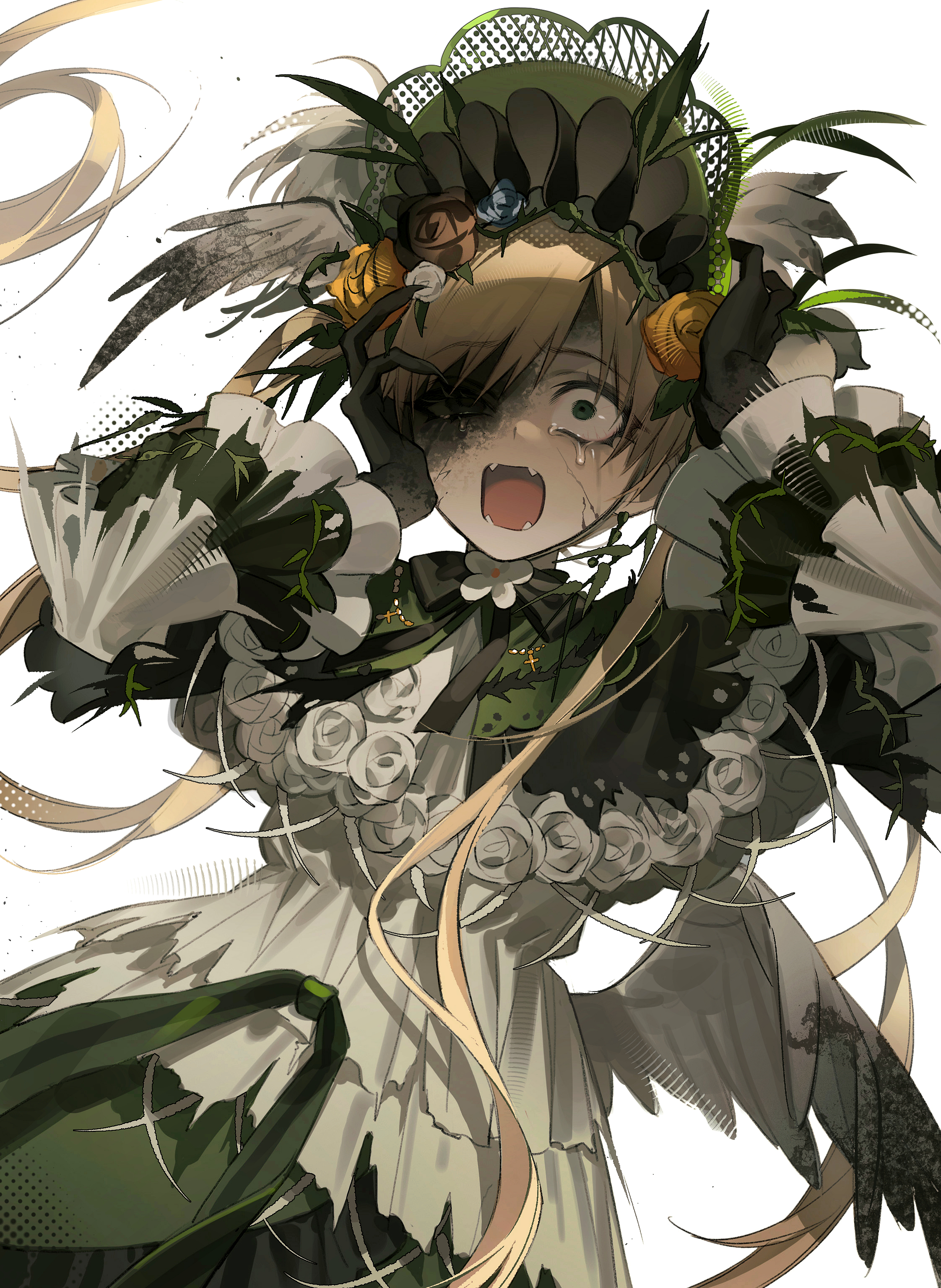 1girl absurdres black_flower black_hands black_ribbon black_rose blonde_hair chinese_commentary colored_extremities commentary_request constricted_pupils cowboy_shot cracked_skin crying crying_with_eyes_open despair dress fangs feathered_wings floating_hair flower green_bonnet green_dress green_eyes hand_on_own_head highres jiu_zhi_jun_(kipll_bobo) lolita_fashion long_hair long_sleeves mahou_shoujo_no_majo_saiban neck_ribbon open_mouth ribbon rose screaming simple_background solo spoilers tears tono_hanna torn_clothes torn_dress twintails white_background wide-eyed wings witch_(manosaba) yellow_flower yellow_rose
