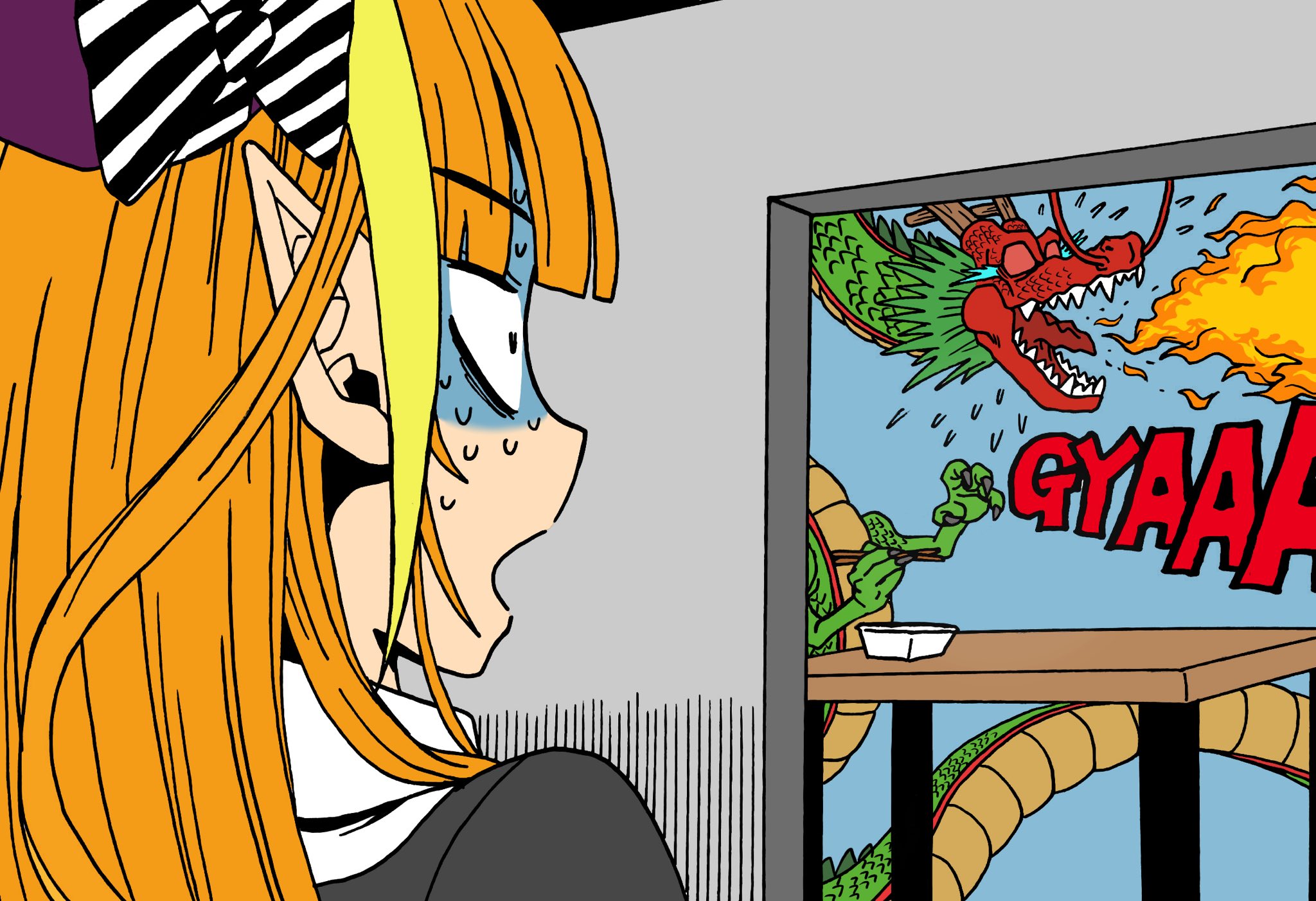 1girl blonde_hair bow bowtie breath_weapon breathing_fire chopsticks commentary_request diagonal-striped_bow diagonal-striped_bowtie diagonal-striped_clothes dragon dragon_ball dragon_horns eastern_dragon fire flying_sweatdrops gloom_(expression) highres holding holding_chopsticks hololive horns kiryu_coco lee_(dragon_garou) multicolored_hair nervous_sweating orange_hair pointy_ears shenron_(dragon_ball) spicy streaked_hair striped_bow striped_bowtie striped_clothes sweat two-tone_hair virtual_youtuber