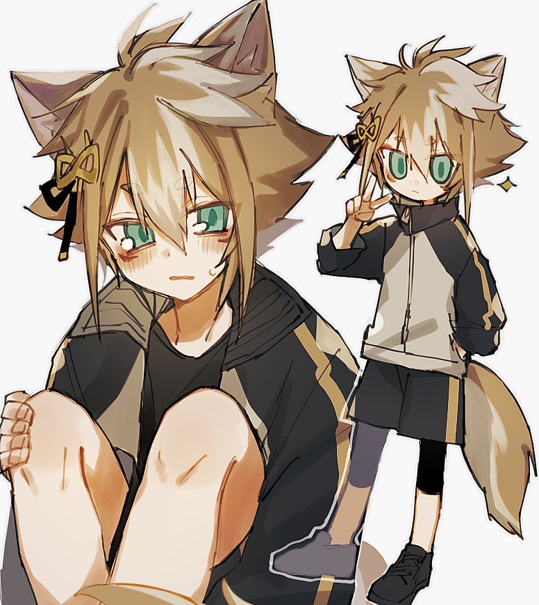 1boy :/ alternate_costume animal_ear_fluff animal_ears aqua_eyes arm_up blush closed_mouth collared_jacket dax00 dog_ears dog_tail dot_nose double-parted_bangs full_body genshin_impact gorou_(genshin_impact) hair_between_eyes hair_ornament hand_on_own_knee jacket looking_to_the_side male_focus multicolored_hair multiple_views open_clothes open_jacket sideways_glance simple_background sitting sparkle tail tears track_jacket v vertical-striped_sleeves white_background zipper zipper_pull_tab