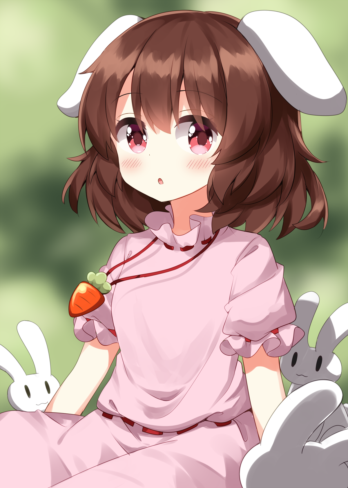 1girl animal_ears blurry blurry_background blush brown_hair carrot_necklace commentary_request completion_time cowboy_shot dress floppy_ears green_background highres inaba_tewi jewelry looking_at_viewer necklace open_mouth pink_dress rabbit rabbit_ears rabbit_girl red_eyes ribbon-trimmed_sleeves ribbon_trim ruu_(tksymkw) short_hair short_sleeves solo touhou