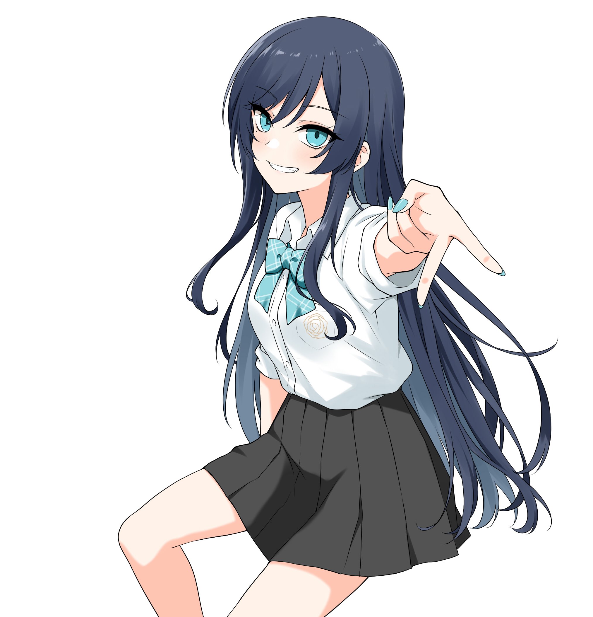 1girl ado_(utaite) black_skirt blue_bow blue_bowtie blue_eyes blue_hair blue_nails bow bowtie chando_(ado) clenched_teeth collared_shirt commentary dress_shirt felutiahime gyaru_v highres long_hair looking_at_viewer mole mole_under_eye nail_polish pelt shirt short_sleeves simple_background skirt solo teeth utaite v white_background white_shirt