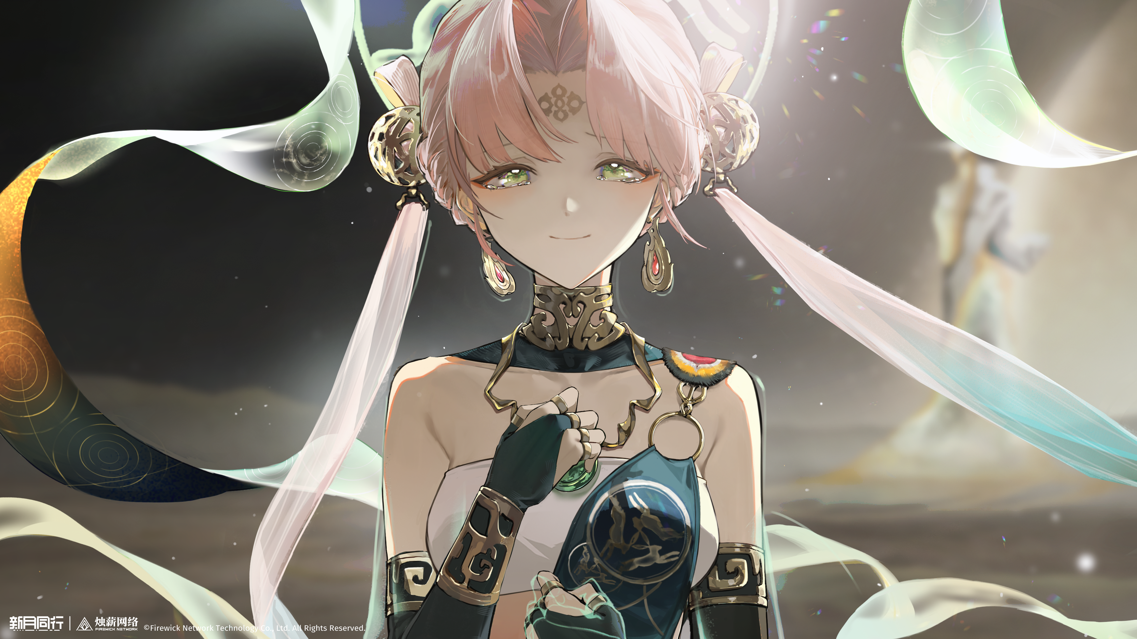 1girl absurdres bare_shoulders black_bridal_gauntlets blurry blurry_background bridal_gauntlets copyright_name copyright_notice earrings facial_mark forehead_mark gold_choker green_eyes hagoromo hair_ornament hands_up highres jewelry logo long_hair looking_at_viewer official_art official_wallpaper parted_bangs pink_hair shawl smile solo straight-on strapless tearing_up tube_top upper_body very_long_hair white_tube_top xinyue_tongxing zhejing_(xinyue_tongxing)