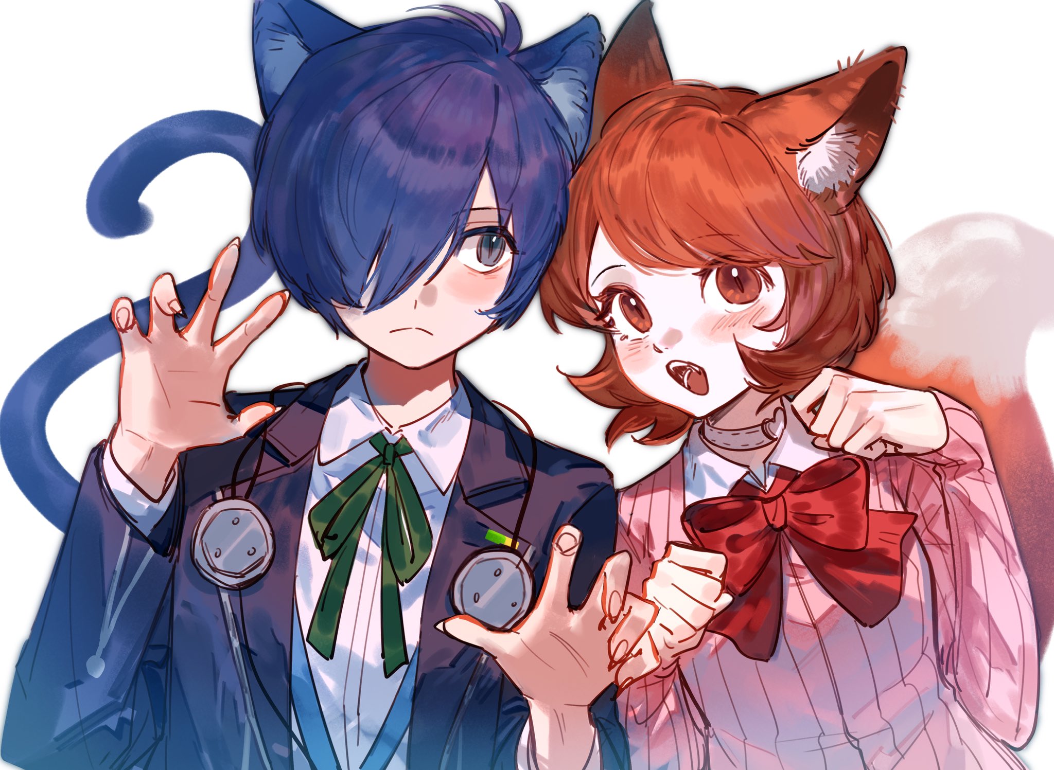 1boy 1girl animal_ear_fluff animal_ears black_jacket blue_eyes blue_hair blush bow bowtie brown_eyes brown_hair cardigan cat_boy cat_ears cat_tail choker claw_pose closed_mouth commentary earphones_removed fingernails flipped_hair fox_ears fox_girl fox_tail frown gekkoukan_high_school_uniform green_ribbon hair_over_one_eye hands_up heart heart_choker highres jacket kemonomimi_mode long_sleeves looking_at_viewer one_eye_covered open_clothes open_jacket open_mouth paw_pose persona persona_3 pink_cardigan red_bow red_bowtie ribbed_cardigan ribbon rrrrrrrrrrrou1 school_uniform shirt short_hair sideways_glance simple_background tail takeba_yukari upper_body white_background white_choker white_shirt wing_collar yuuki_makoto_(persona_3)