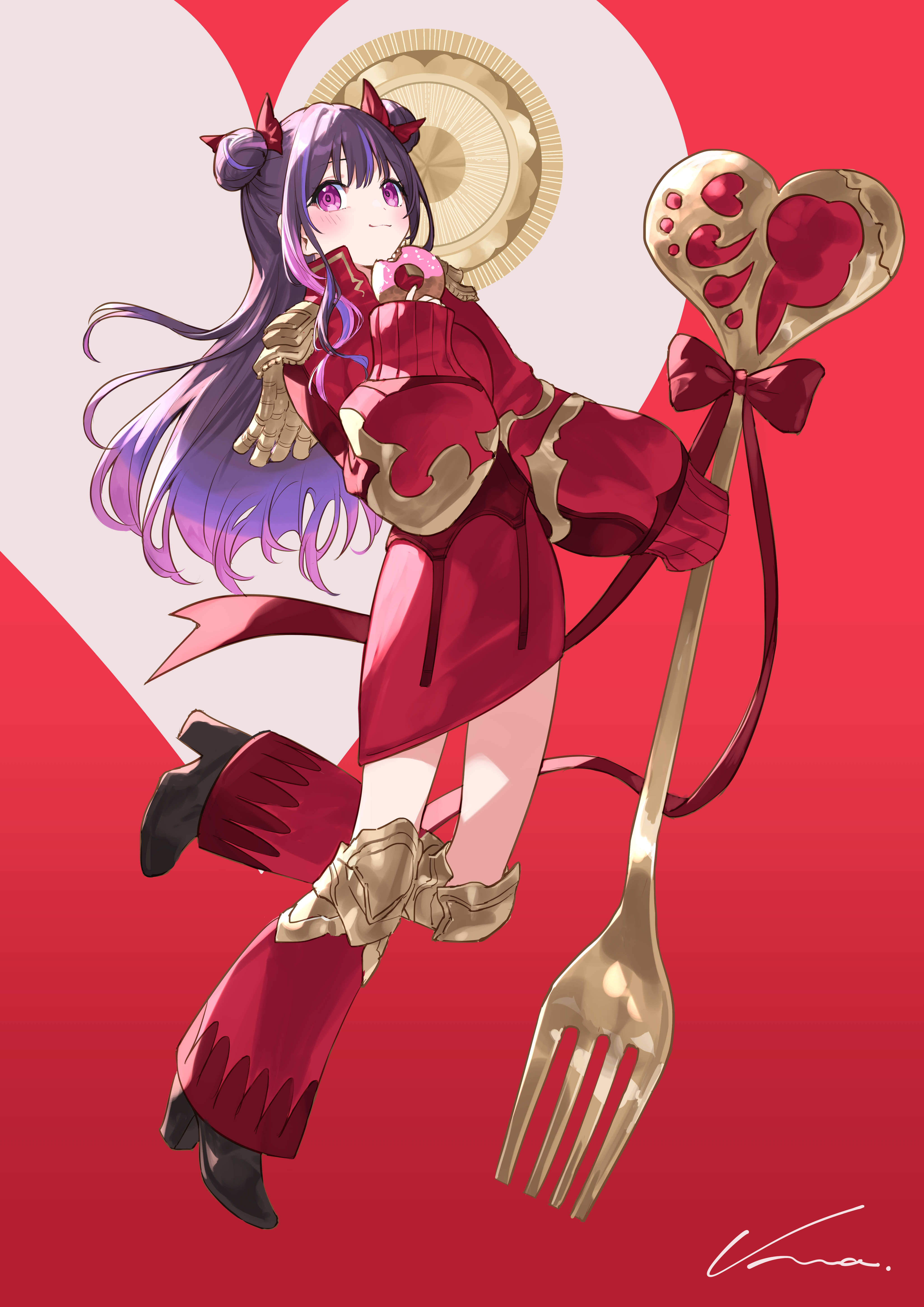 1girl :3 absurdres alternate_costume black_shoes bow commentary donut double_bun dress english_commentary epaulettes food fork full_body giant_fork gradient_hair hair_bow hair_bun heart high_heels highres holding holding_donut holding_food knee_armor leg_warmers light_blush long_hair long_sleeves mikure_narin multicolored_hair nemoto_yuuma puffy_long_sleeves puffy_sleeves purple_eyes purple_hair red_background red_bow red_dress shoes short_dress sleeves_past_fingers sleeves_past_wrists solo streaked_hair virtual_youtuber vspo! vspo!_en