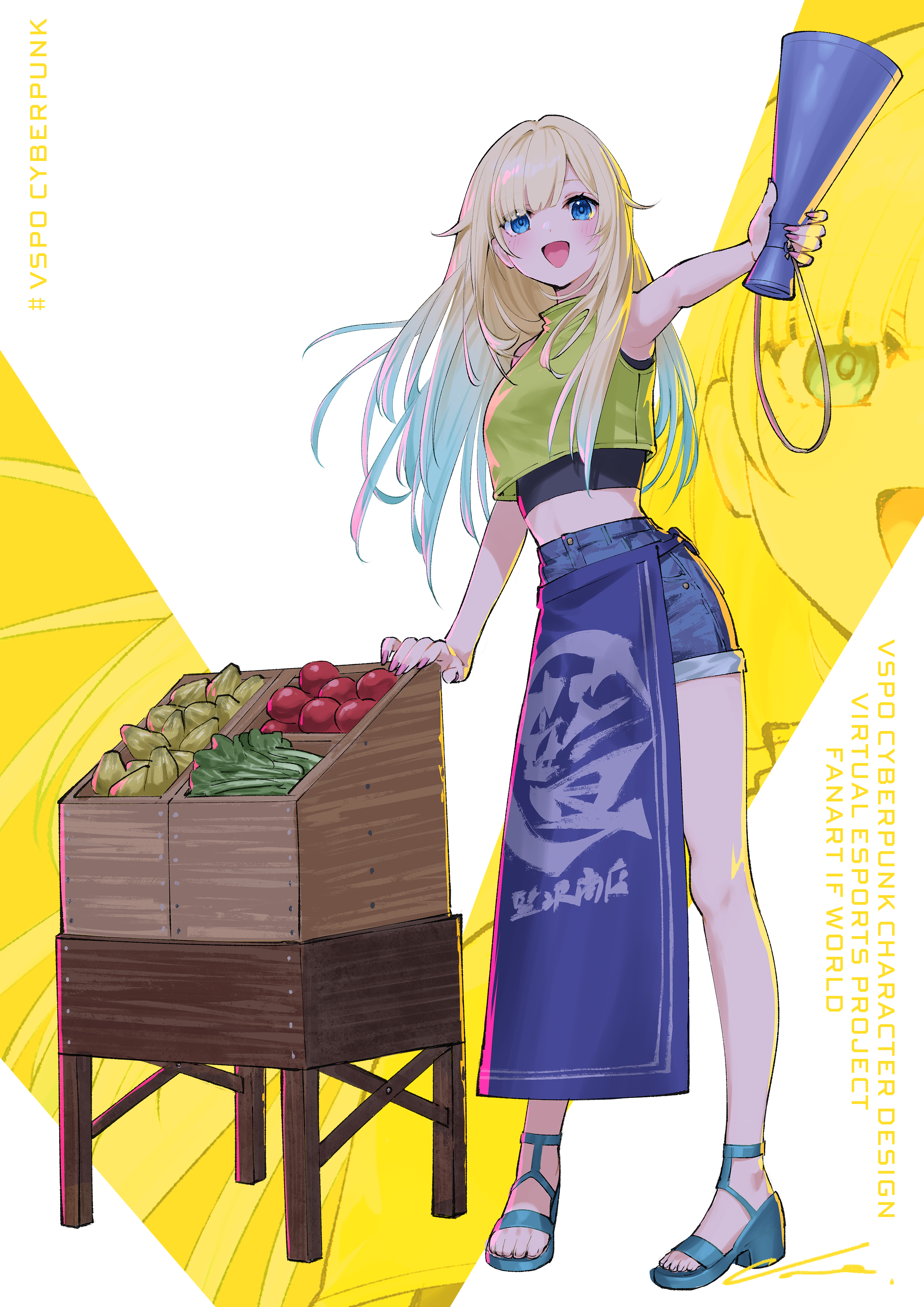 1girl absurdres aizawa_ema alternate_costume apron blonde_hair blue_hair blue_sandals blush commentary crop_top denim denim_shorts english_commentary fingernails food fruit full_body gradient_hair highres holding long_fingernails megaphone midriff multicolored_hair nail_polish nemoto_yuuma open_mouth pink_nails sandals shirt shorts sleeveless sleeveless_shirt standing table two-tone_background vegetable virtual_youtuber vspo! waist_apron white_background wooden_box wooden_table zoom_layer