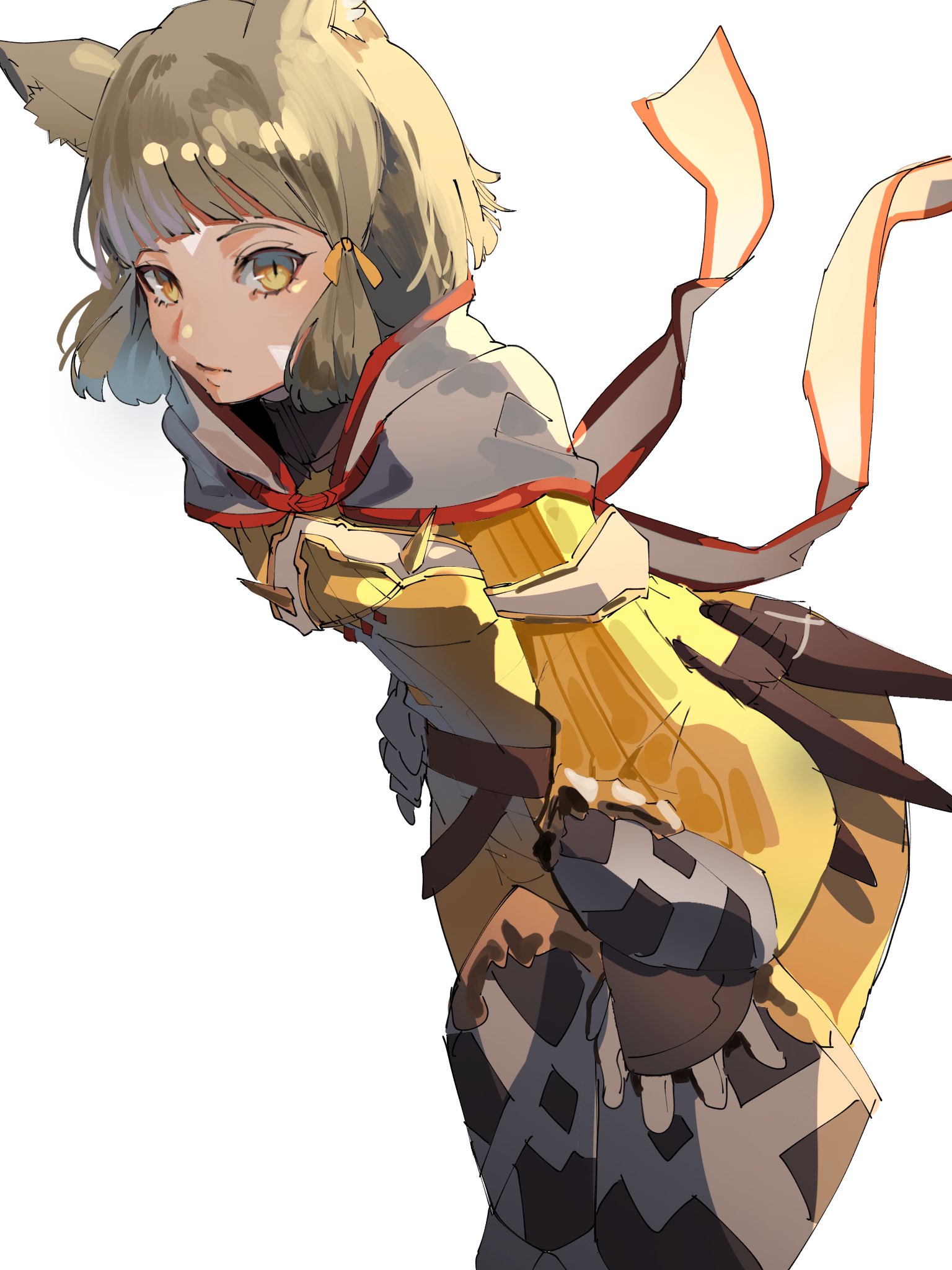 1girl 4me3ba_niku animal_ears arched_bangs blunt_bangs cat_ears commentary facial_mark gloves grey_hair hand_on_own_hip hand_on_own_leg highres jumpsuit leaning_forward nia_(xenoblade) ribbed_jumpsuit short_hair solo symbol-only_commentary white_background white_gloves xenoblade_chronicles_(series) xenoblade_chronicles_2 yellow_eyes yellow_jumpsuit