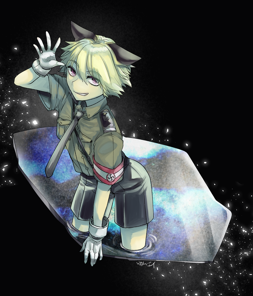 1boy animal_ears arm_support arm_up armband belt black_background black_necktie blonde_hair bloom cat_boy cat_ears commentary_request floating_clothes from_above gloves green_shirt grey_shorts grin hair_between_eyes hellsing highres hitler_youth leaning_forward light_particles looking_at_viewer looking_up male_focus medium_hair military_uniform moriyama_ei nazi necktie open_hand partially_submerged pocket portal_(object) print_armband purple_eyes red_armband redrawn ripples sanpaku schroedinger_(hellsing) shards shirt short_shorts short_sleeves shorts shoulder_boards shoulder_strap signature smile solo striped_armband striped_clothes swastika swastika_print teeth through_portal trap white_gloves wing_collar