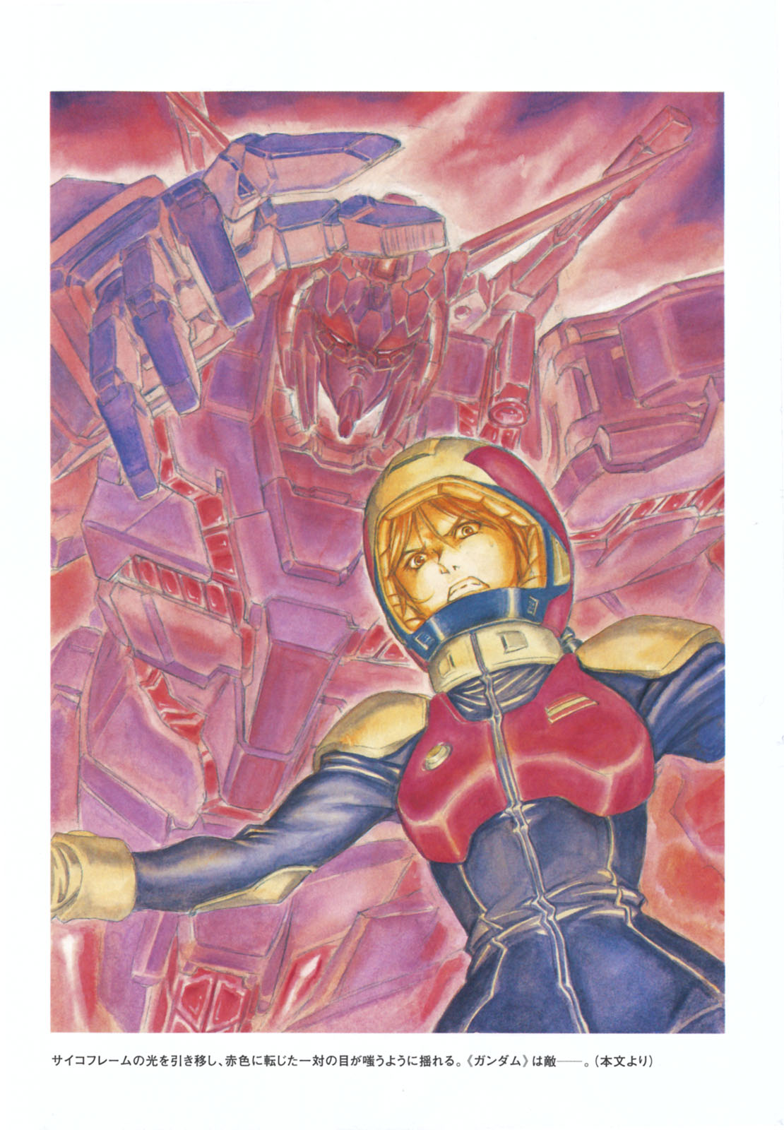 1girl angry artist_request energy_field glowing gundam gundam_unicorn highres machinery magazine_scan marida_cruz mecha mecha_pilot_suit mobile_suit neo_zeon painting_(medium) pilot production_art robot scan science_fiction traditional_media translation_request unicorn_gundam v-fin
