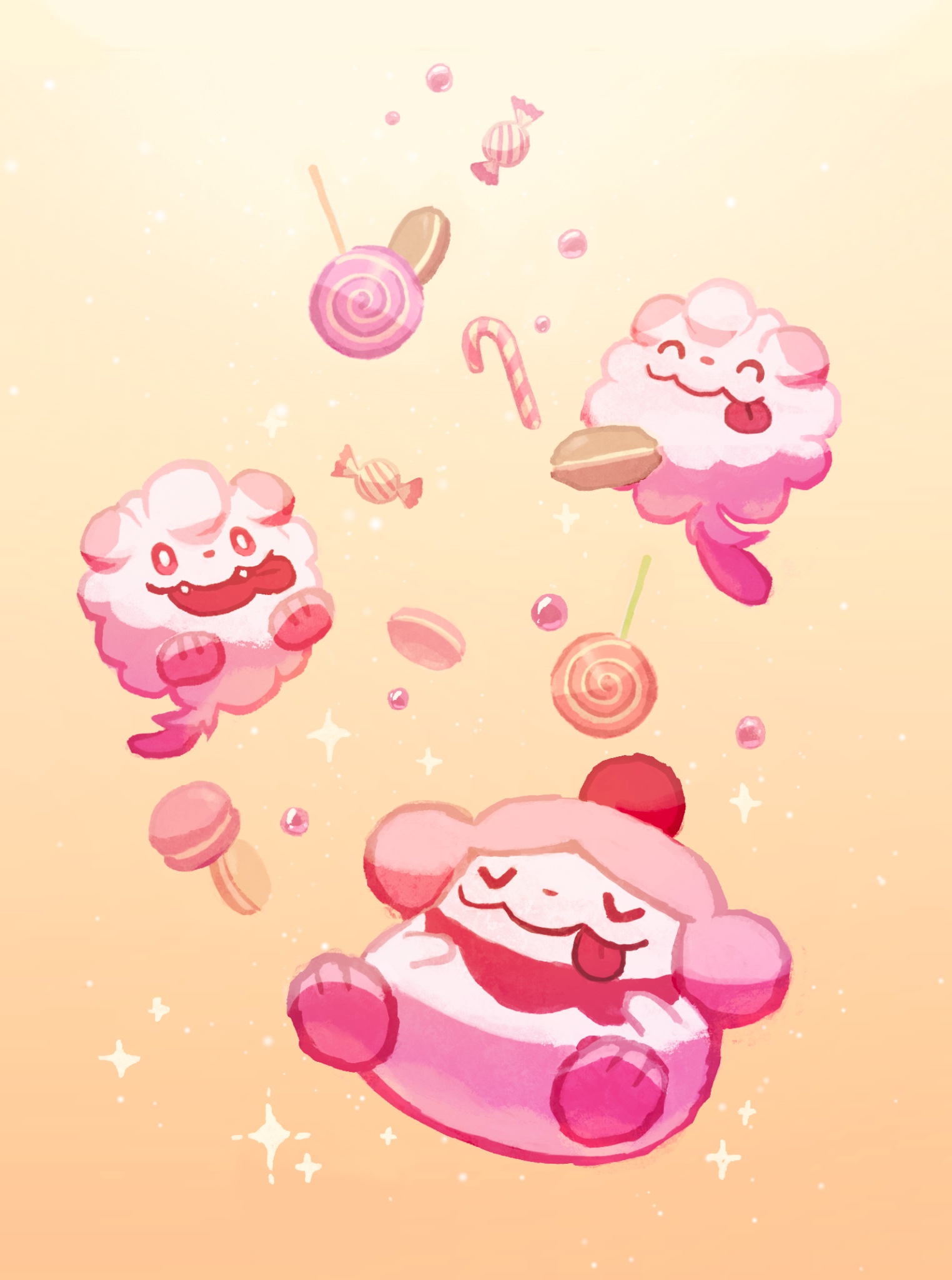 :d aruco_co candy closed_eyes closed_mouth commentary_request evolutionary_line fangs food gen_6_pokemon highres lollipop macaron nintendo no_humans open_mouth pink_eyes pokemon pokemon_(creature) pokemon_focus red_eyes slurpuff smile swirlix tongue tongue_out