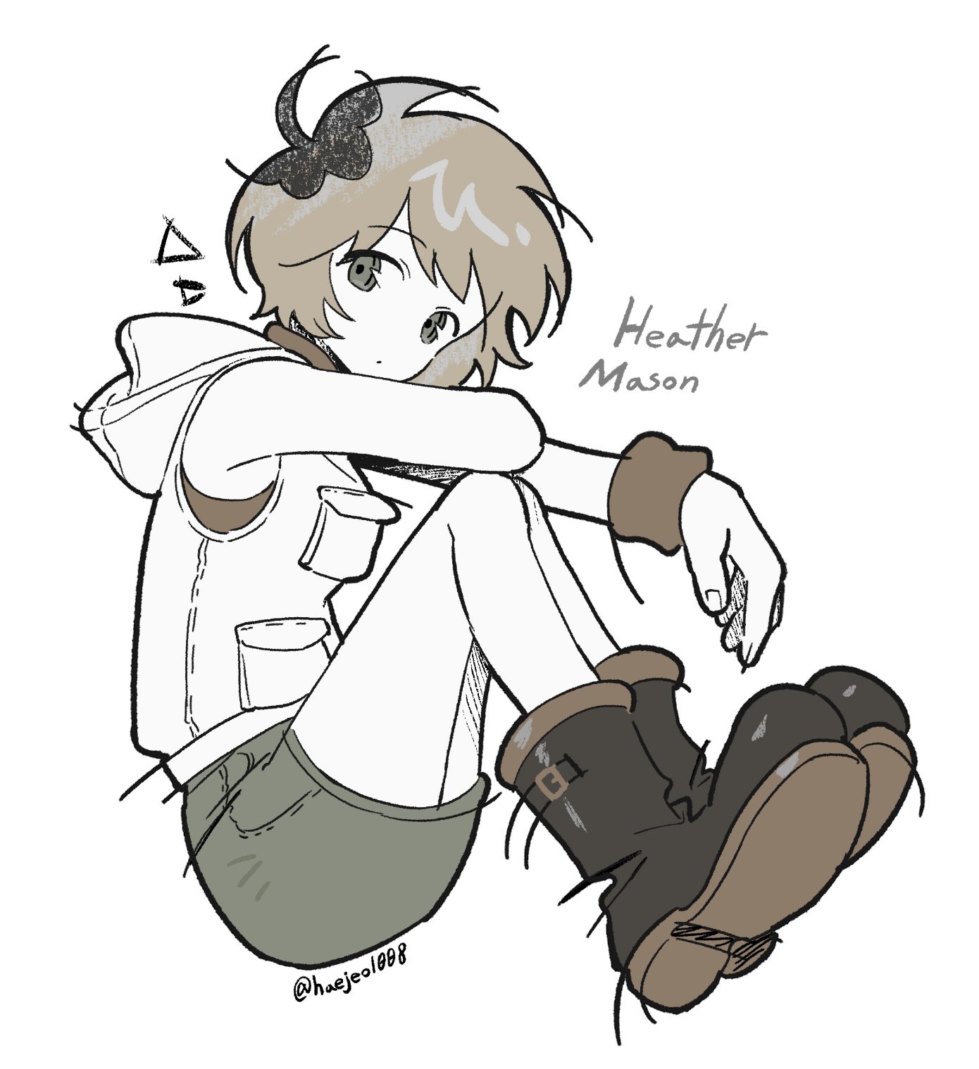 1girl black_hair boots brown_hair character_name full_body grey_eyes haejeo1008 heather_mason highres hood hood_down hoodie knees_up looking_to_the_side miniskirt multicolored_hair roots_(hair) short_hair silent_hill_(series) silent_hill_3 skirt sleeveless sleeveless_hoodie solo twitter_username wristband