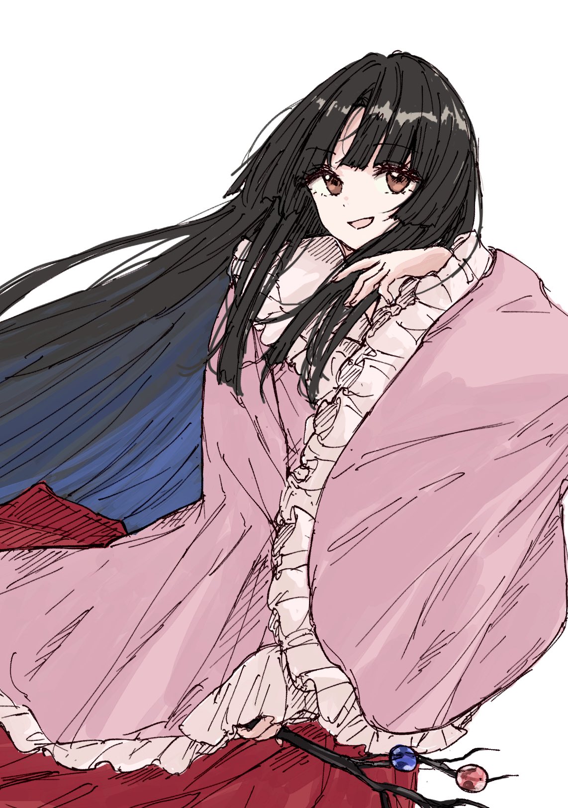 1girl black_hair branch brown_eyes commentary_request frills hand_up highres hime_cut houraisan_kaguya jeweled_branch_of_hourai kashiwada_kiiho long_hair long_sleeves looking_at_viewer parted_lips pink_shirt puffy_sleeves red_skirt shirt skirt smile solo touhou very_long_hair white_background