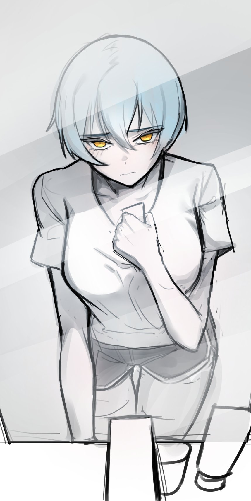1girl angela_(project_moon) black_shorts blue_hair blush breasts clenched_hand glowing glowing_eyes hair_between_eyes hair_intakes hand_on_own_chest hashtag-only_commentary helseujang highres holding holding_paper library_of_ruina looking_at_mirror looking_at_viewer medium_breasts mirror paper project_moon reflection shirt short_hair shorts sink solo white_shirt yellow_eyes