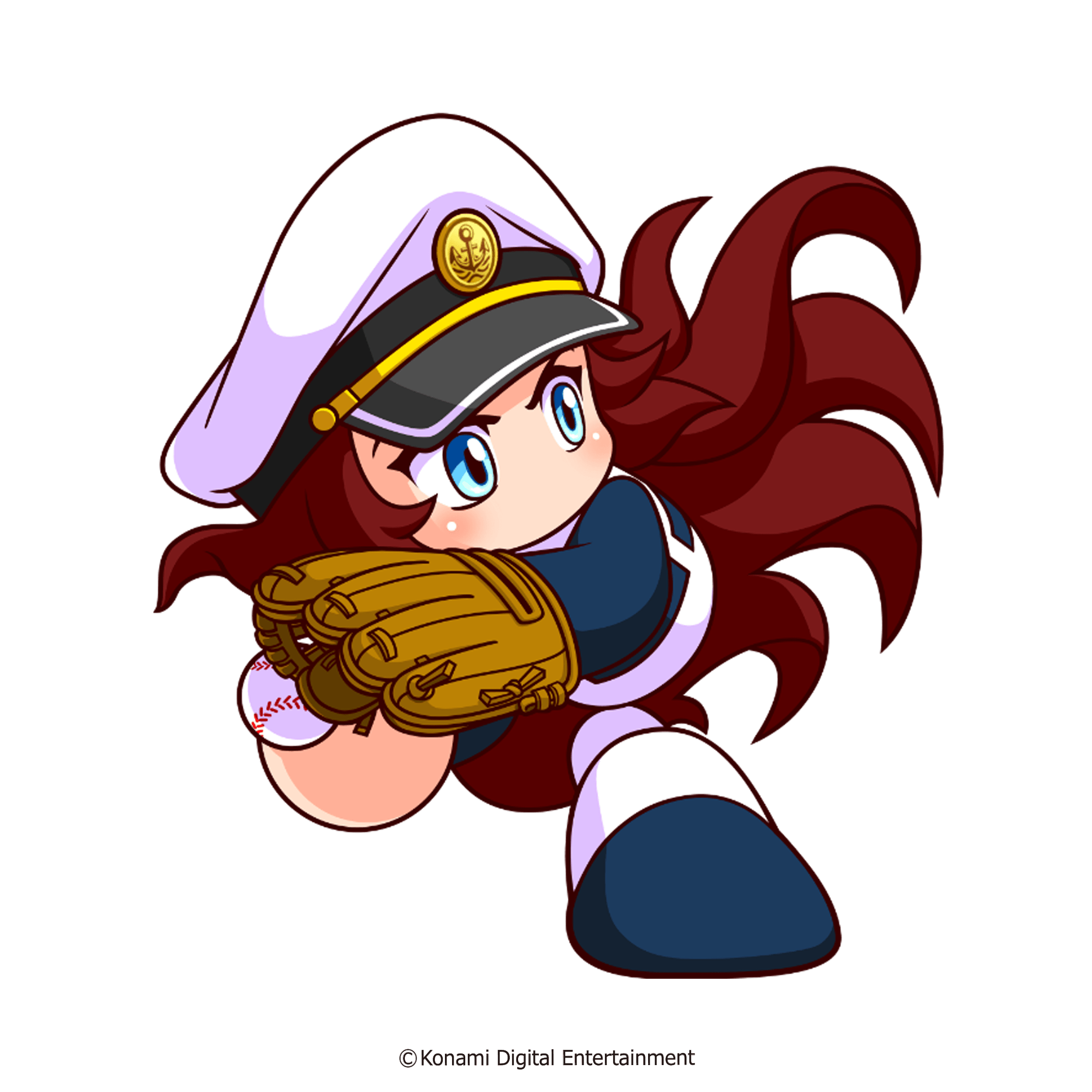 1girl artist_request ball baseball_(object) baseball_glove baseball_uniform blue_eyes brown_hair copyright_notice hat highres holding holding_ball jikkyou_powerful_pro_yakyuu jikkyou_powerful_pro_yakyuu_(style) long_hair no_mouth official_art peaked_cap rayman_limbs solo sportswear tatehashi_minato