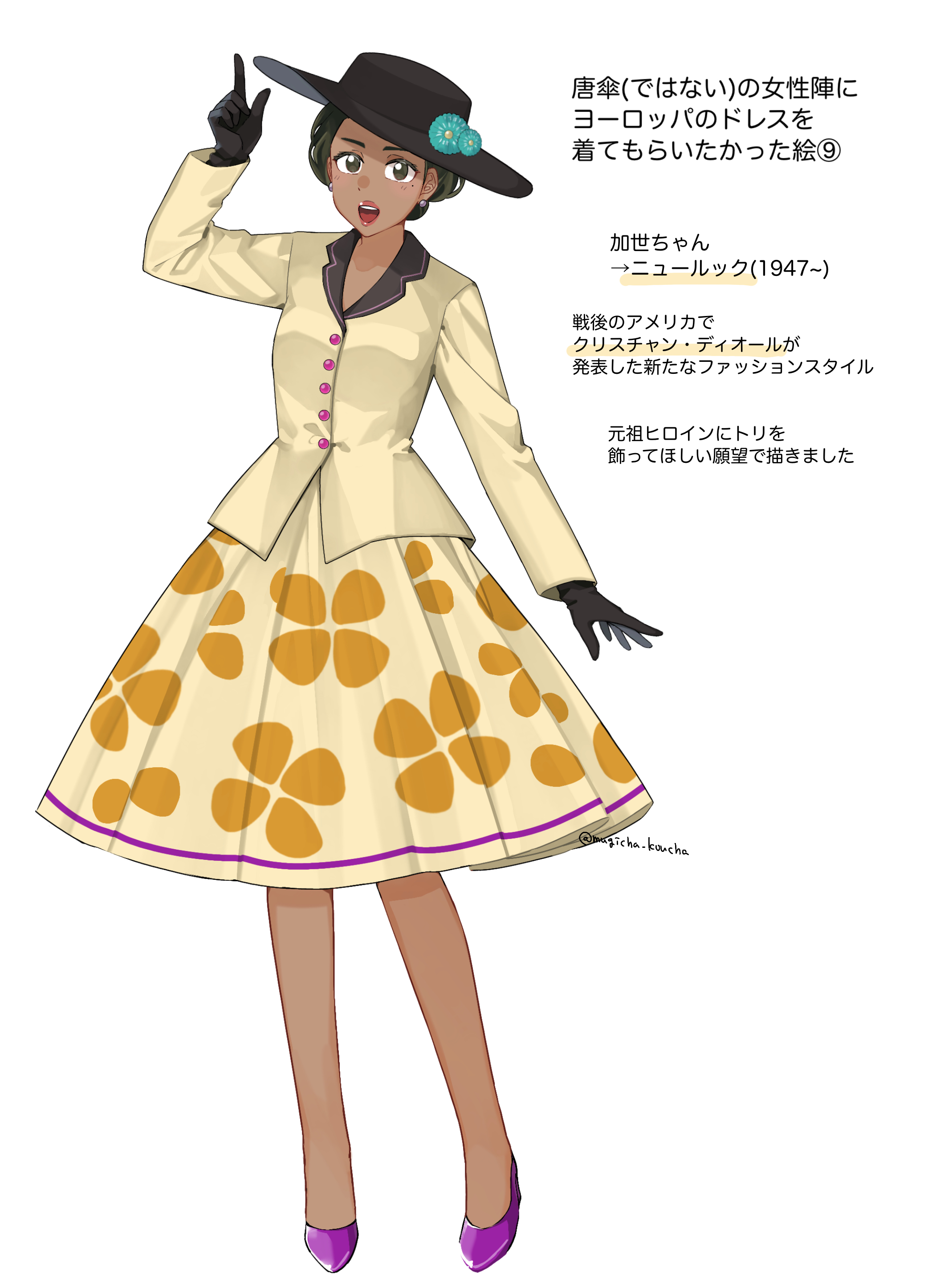 1girl :d absurdres alternate_costume aqua_flower arm_up black_eyes black_gloves black_hair black_hat buttons character_request check_character commentary_request contrast_lapels dark-skinned_female dark_skin earrings fashion flats floral_print floral_print_skirt flower full_body gloves hat hat_flower highres index_finger_raised jacket jewelry lapels lipstick long_sleeves looking_at_viewer makeup medium_skirt mole mole_under_eye mononoke mugicha_koucha no_pupils no_socks nomoto_chiyo notched_lapels open_mouth pearl_earrings pink_lips pointing pointing_up print_skirt purple_shoes shoes simple_background skirt smile solo standing sun_hat translation_request twitter_username white_background wide_brim yellow_jacket yellow_skirt