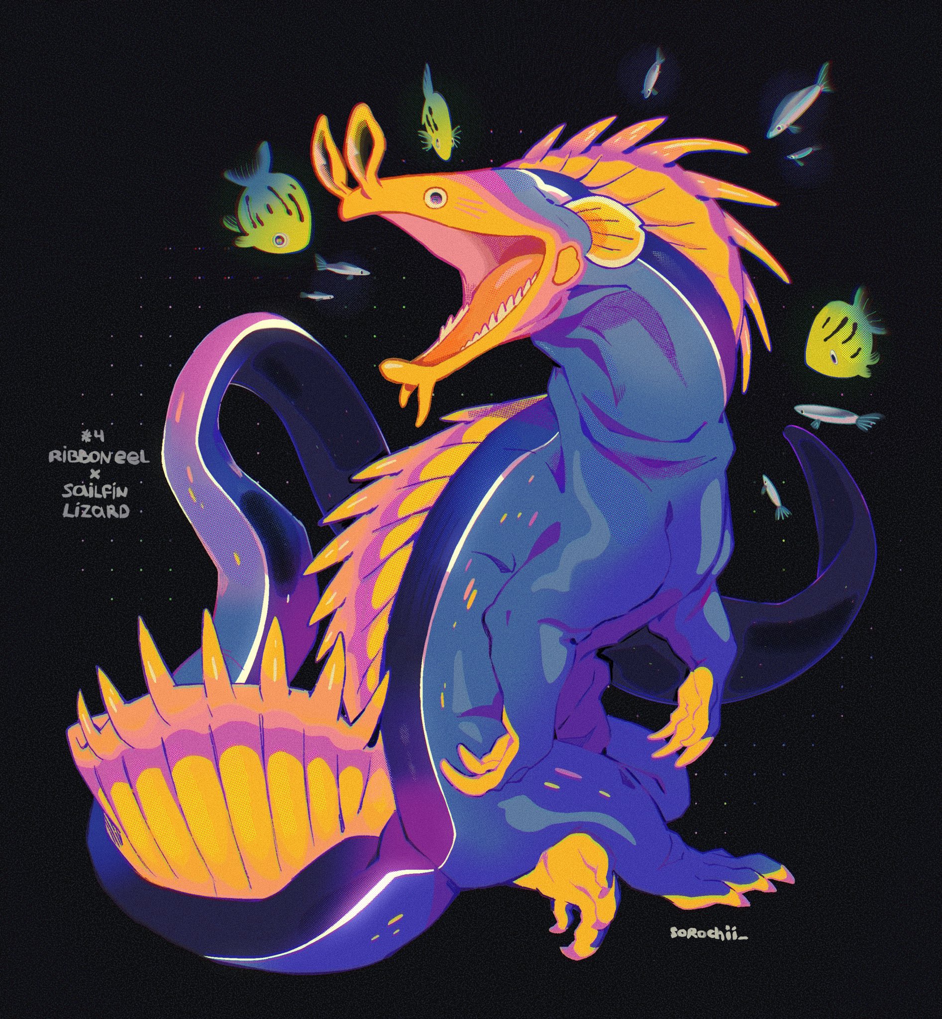 black_background chimera claws colored_skin commentary creature eel english_text film_grain fish glowing highres lizard multicolored_skin neck_spikes no_humans open_mouth original ribbon_eel sailfin_lizard sharp_teeth simple_background sorochii spiked_tail symbol-only_commentary tail teeth twitter_username