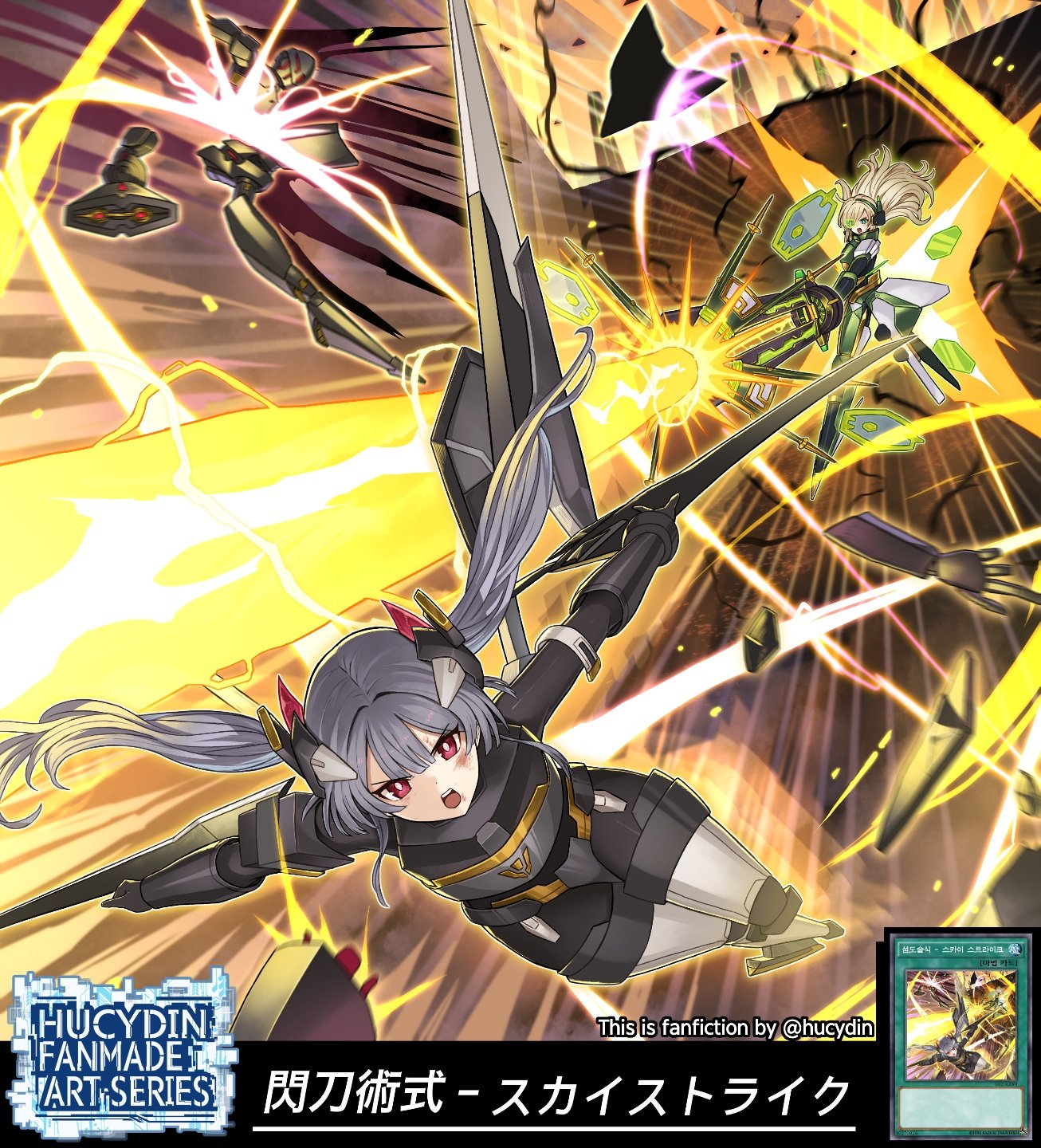 2girls alternate_costume blonde_hair duel_monster gloves grey_hair highres holding holding_weapon hucydin long_hair long_sleeves multiple_girls official_style power_suit red_eyes science_fiction scouter sky_striker_ace_-_hayate sky_striker_ace_-_raye sky_striker_ace_-_roze tagme weapon yu-gi-oh!