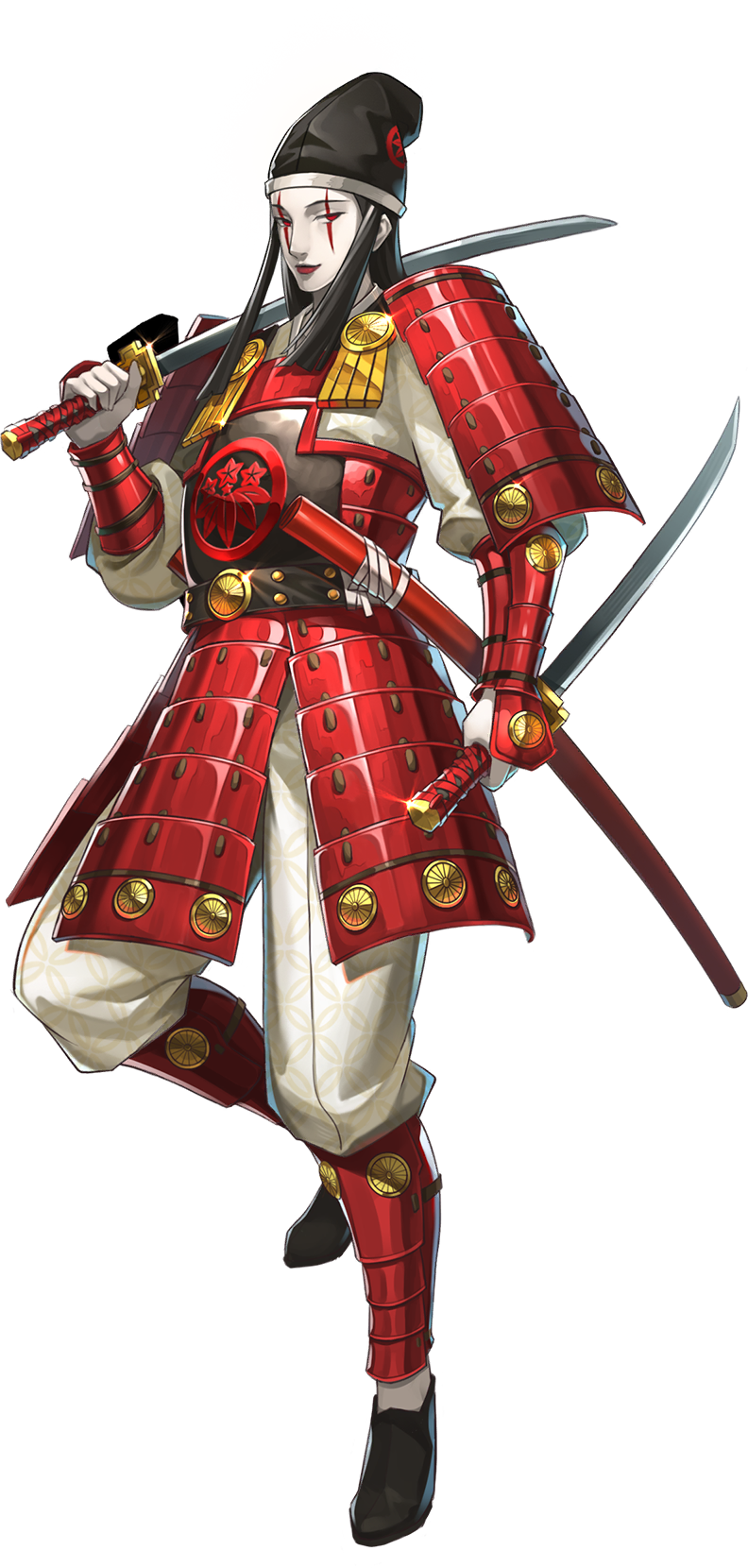 1boy armor artist_request black_hair demon_(megami_tensei) dual_wielding hat highres holding holding_sword holding_weapon japanese_armor kote kusazuri long_sidelocks official_art pale_skin persona persona_5 persona_5:_the_phantom_x red_eyes red_lips scabbard sheath shin_megami_tensei sidelocks solo sword third-party_source transparent_background weapon yoshitsune_(megami_tensei)