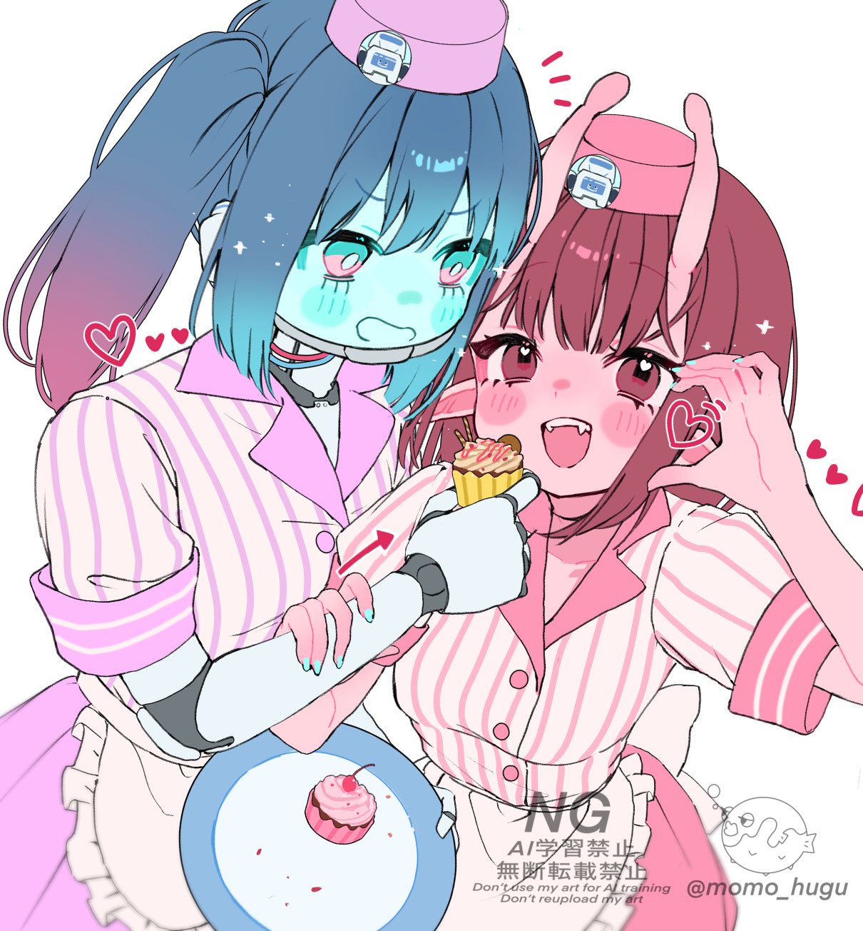2girls alien antennae apron blue_hair blush face_filter food heart heart_hands highres kujo_chiharu kurusu_makina_(milky_galactic_universe) mechanical_hands mechanical_neck medium_hair metal_jaw milky_subway momofugu multiple_girls open_mouth plate red_eyes red_hair robot_girl smile sweets twintails waitress watermark white_apron white_background