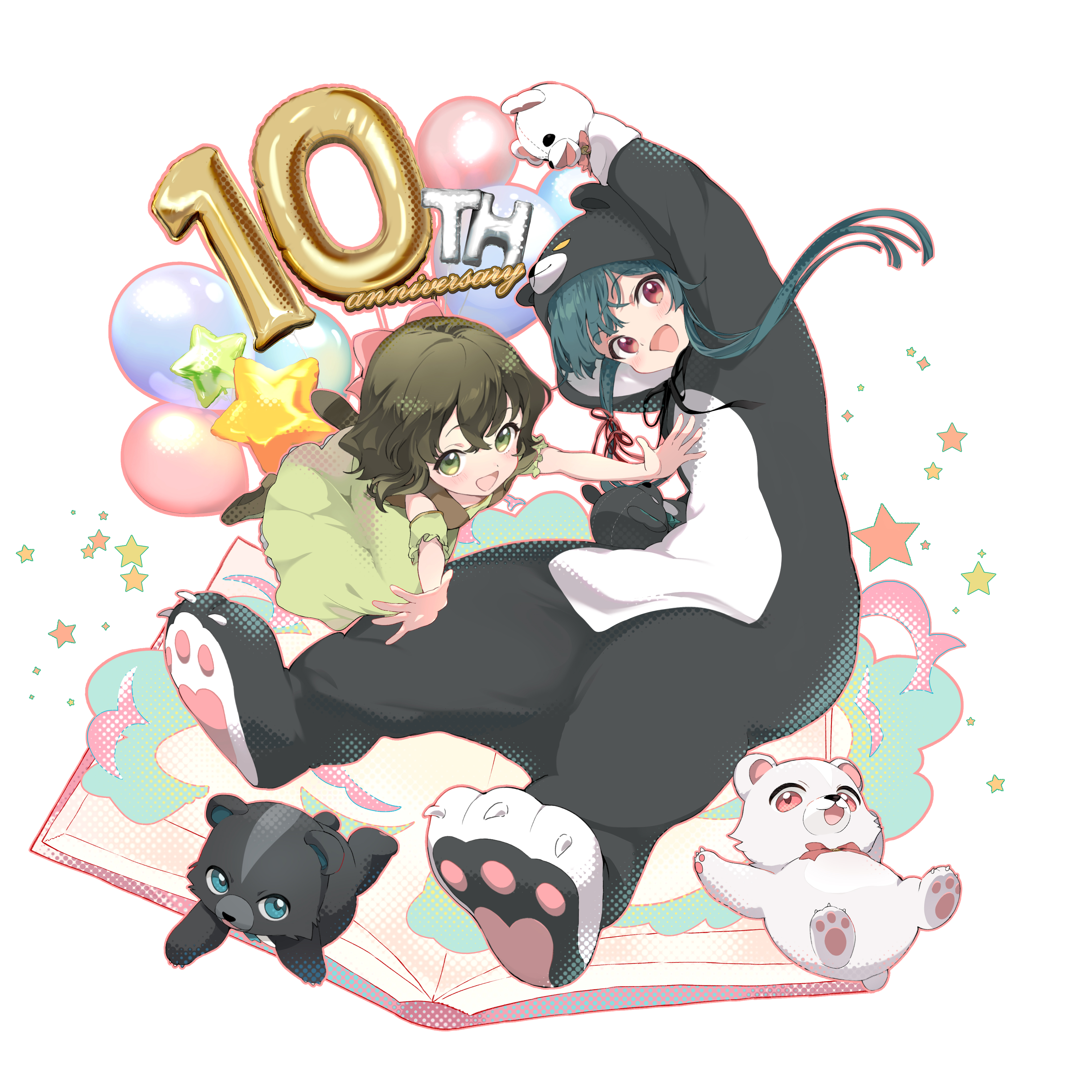 029 2girls :d absurdres animal animal_costume animal_ears animal_hood anniversary aqua_hair arm_up balloon bear bear_costume bear_ears bear_hood blush book cosplay dress fina_(kuma_kuma_kuma_bear) full_body green_dress green_eyes green_hair hand_puppet highres hood kigurumi kuma_kuma_kuma_bear loafers long_hair long_sleeves looking_at_viewer multiple_girls official_art open_book open_mouth outstretched_arms puppet red_eyes ribbon shoes short_hair short_sleeves simple_background smile star_(symbol) white_background yuna_(kuma_kuma_kuma_bear)