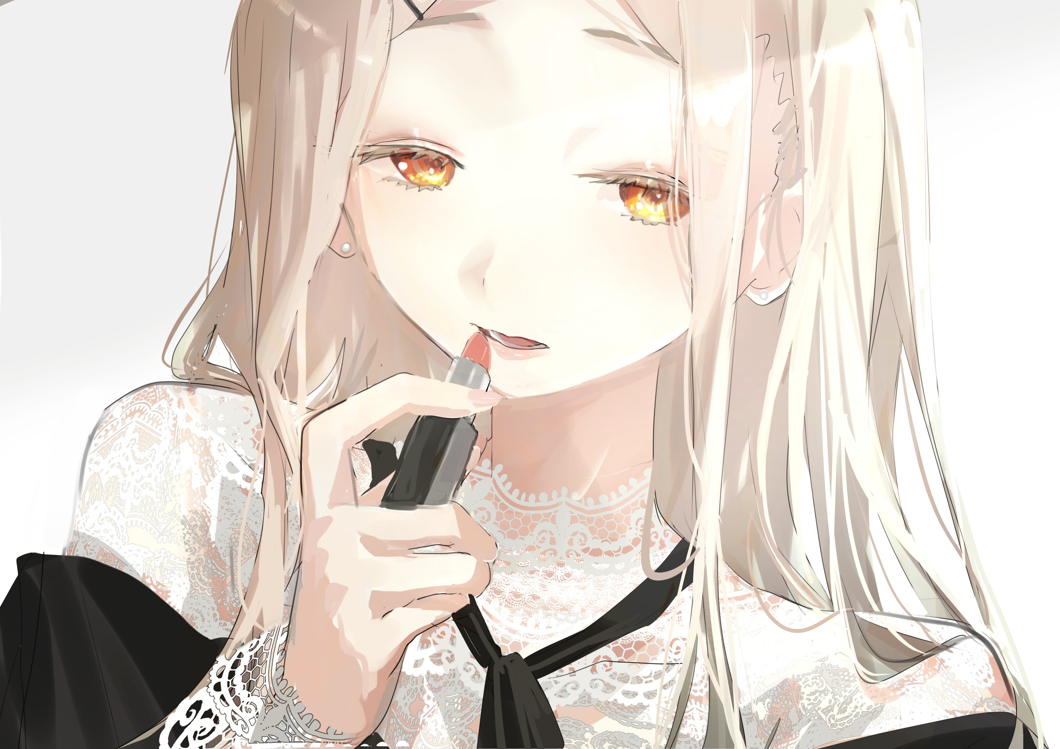 1girl absurdres applying_lipstick applying_makeup applying_own_makeup black_neckerchief black_shirt blonde_hair colored_eyelashes commentary_request cosmetics earrings gakuen_idolmaster hand_up highres holding holding_lipstick_tube idolmaster jewelry jio_(baku_zugogo) lace_shirt lipstick_tube long_hair long_sleeves looking_at_viewer neckerchief off_shoulder open_mouth orange_eyes shinosawa_hiro shirt simple_background solo stud_earrings upper_body white_background white_shirt