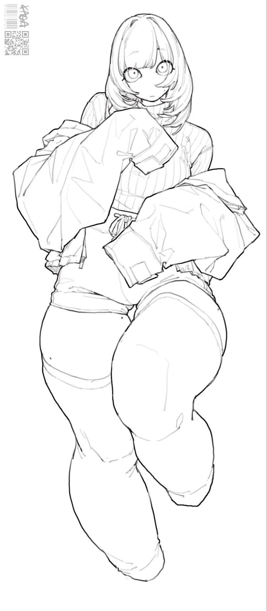 1girl closed_mouth highres kgm mole mole_on_thigh monochrome original over-kneehighs short_hair shorts simple_background sleeve_cuffs solo thighhighs white_background white_shorts