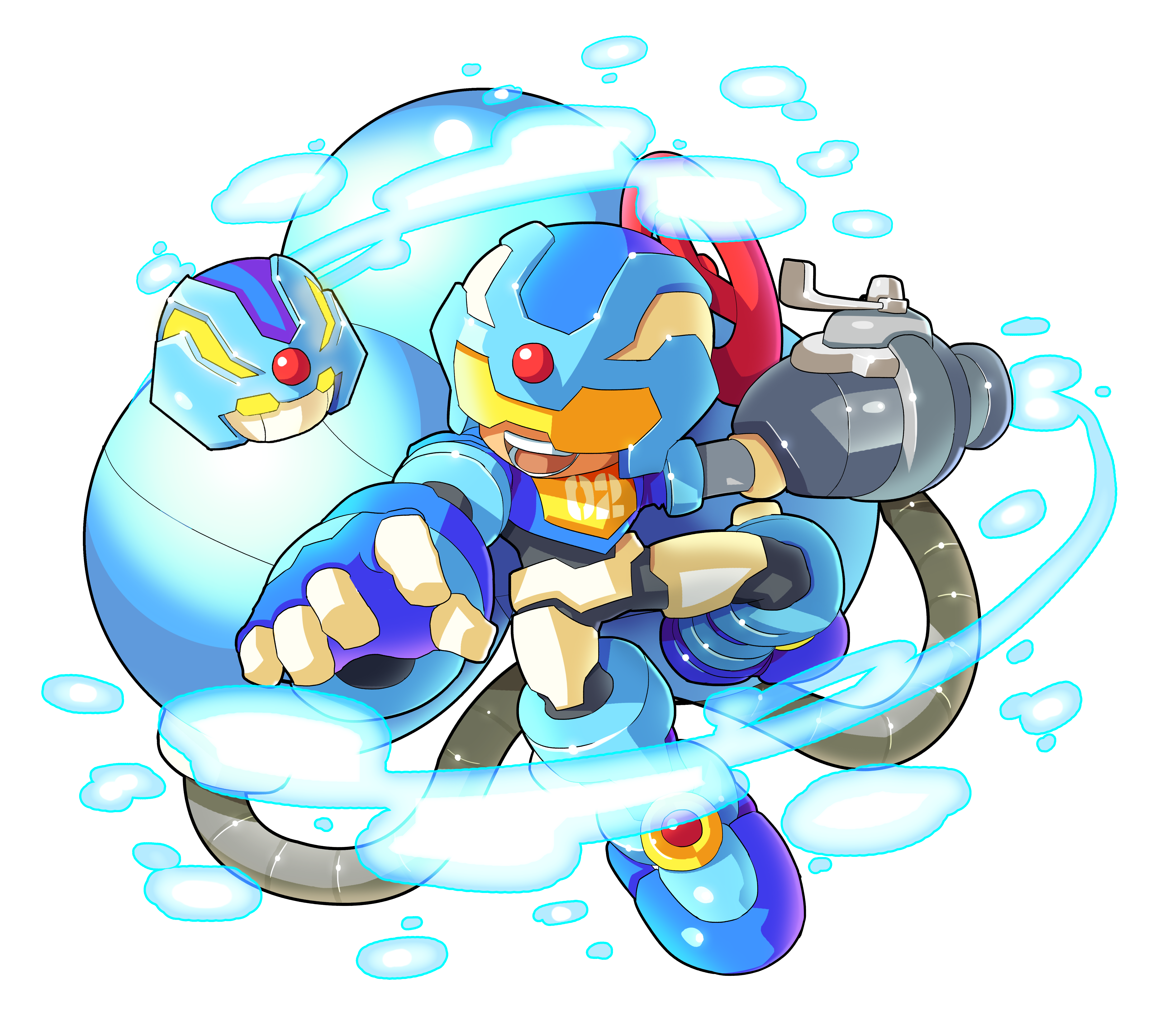 1boy absurdres android arm_cannon armor assault_visor biometal blue_armor blue_helmet bodysuit cryosphere full_body helmet highres mega_man_(series) mega_man_zx mighty_no._9 open_mouth redesign simple_background tagme ultimatemaverickx valve water weapon white_background yellow_visor