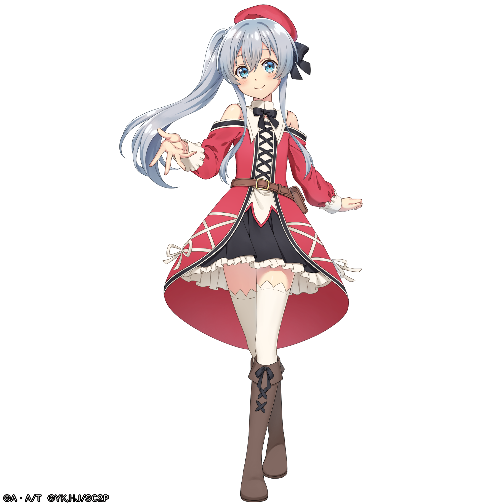 1girl anime_coloring artist_request bare_shoulders belt belt_pouch black_bow black_bowtie black_ribbon blue_eyes blush boots bow bowtie brown_boots celia_claire closed_mouth dress full_body grey_hair hair_between_eyes hat hat_ribbon highres long_hair long_sidelocks long_sleeves looking_at_viewer official_art open_hand palms pouch red_hat ribbon seirei_gensouki short_dress side_ponytail sidelocks simple_background smile solo spread_fingers standing thighhighs transparent_background turtleneck very_long_sidelocks white_thighhighs