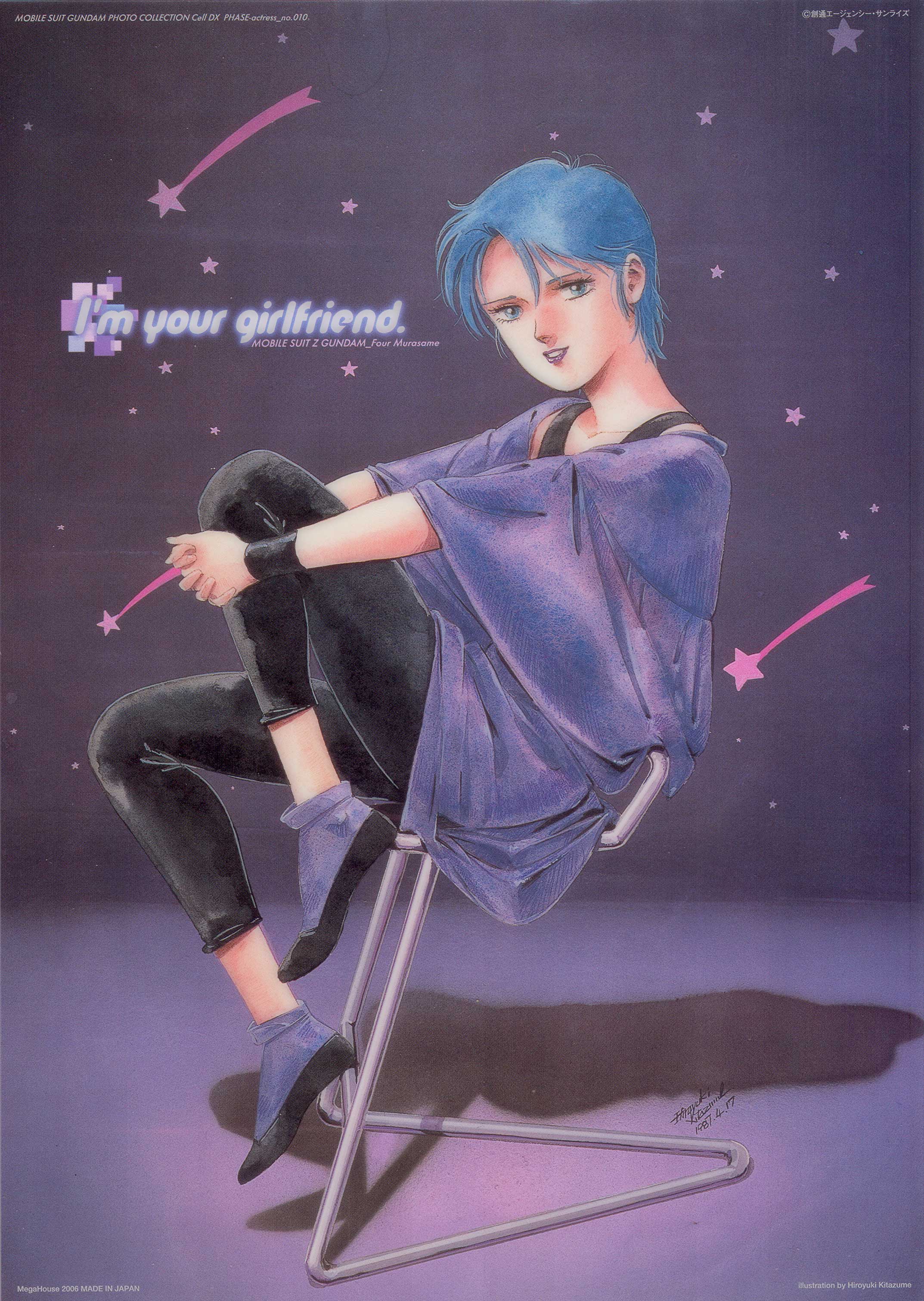 1980s_(style) 1980s_fashion 1987 1girl absurdres artist_name blue_eyes blue_hair chair character_name dated four_murasame grin gundam highres kitazume_hiroyuki looking_at_viewer magazine_scan mixed-language_text official_art oldschool painting_(medium) poster_(medium) promotional_art purple_lips retro_artstyle sandals scan science_fiction shooting_star_(symbol) short_hair sitting smile star_(sky) starry_sky_background title traditional_media wristband zeta_gundam