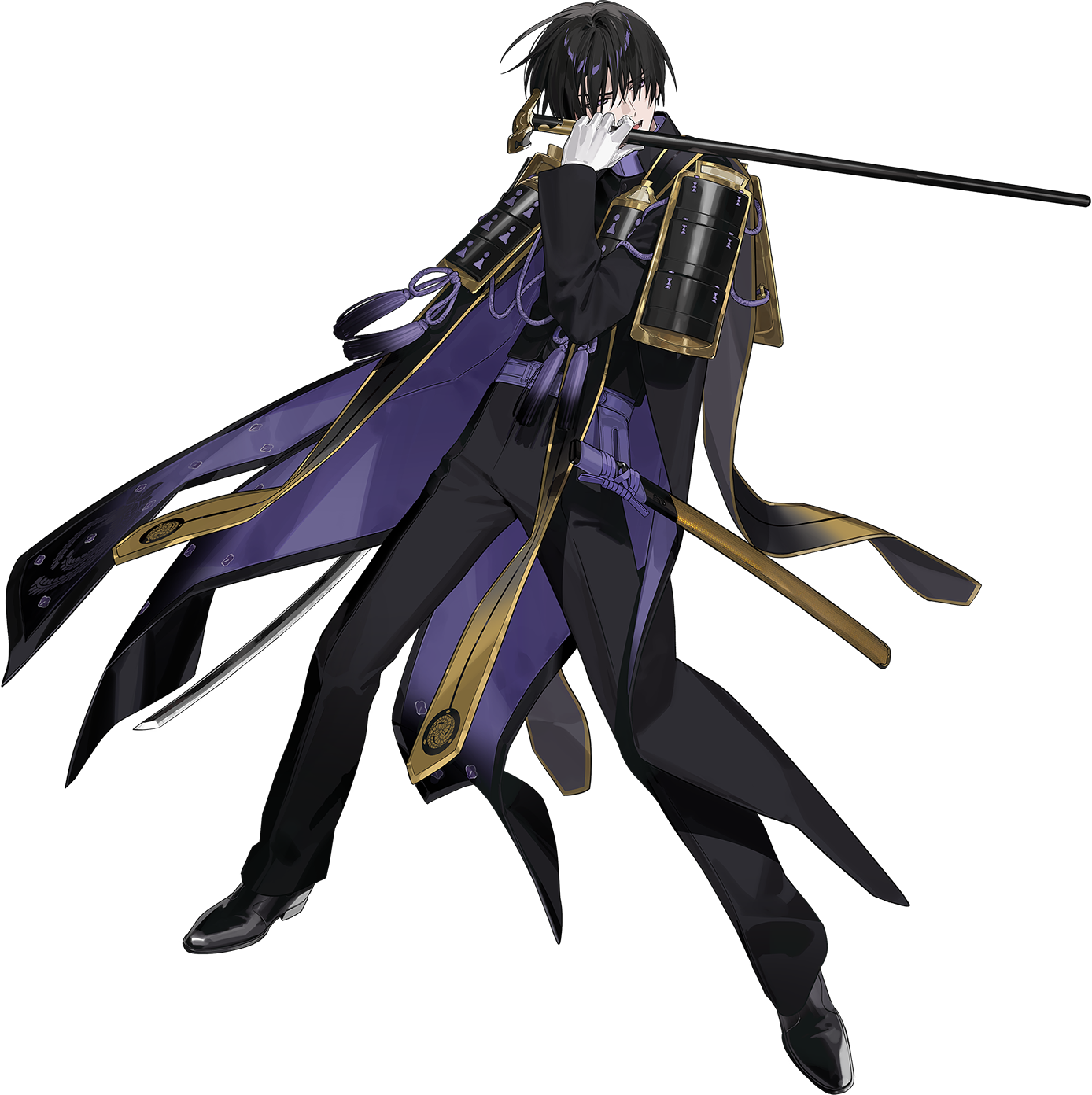 1boy armor asymmetrical_dual_wielding atakigiri_(touken_ranbu) belt black_coat black_hair black_scarf black_shirt black_shoes buttons cane coat coattails collar dress_shoes dual_wielding fighting_stance floating_clothes full_body furrowed_brow gloves gold_trim gradient_scarf hair_over_eyes high_collar highres holding holding_cane holding_sword holding_weapon itefu japanese_armor katana long_coat long_sleeves looking_to_the_side male_focus multicolored_coat official_art open_clothes open_coat open_mouth pale_skin pauldrons print_coat print_scarf purple_belt purple_coat purple_collar purple_eyes purple_rope rope scabbard scarf serious sheath shirt shoes short_hair shoulder_armor sode solo standing stole sword tachi-e tailcoat tassel third-party_source touken_ranbu transparent_background two-tone_coat uchigatana unsheathed variant_set weapon white_gloves yellow_scarf