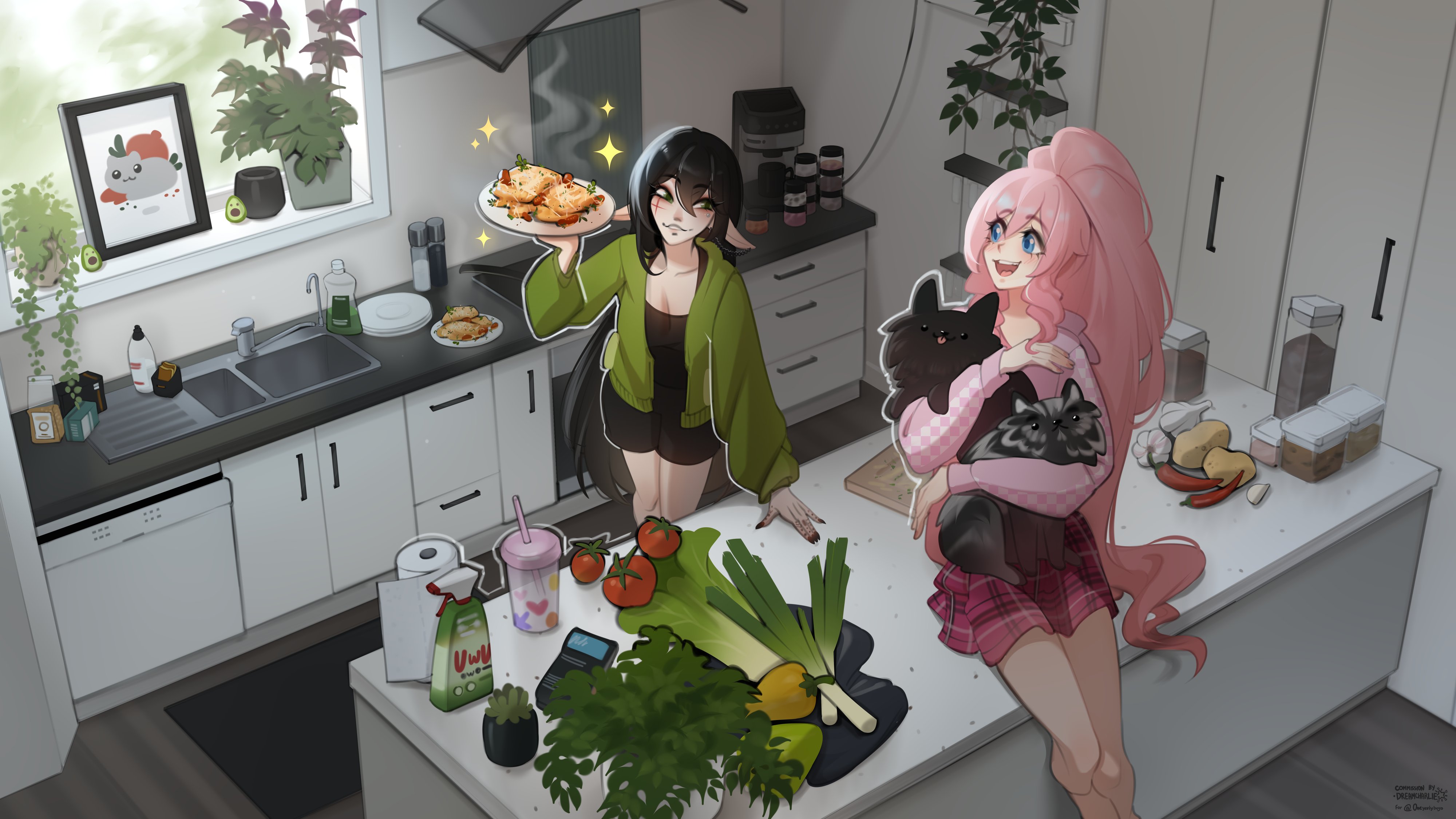 absurdres black_hair blue_eyes chili_pepper coffee_mug colored_skin commentary cooking cup cupboard cutting_board dog drawer dreamcharlie english_commentary food green_eyes green_sweater grey_skin highres hood hoodie indie_virtual_youtuber kitchen layna_lazar leaf long_hair mug olivia_monroe onion painting_(object) paper_towel pepper_shaker picture_frame pink_hair pink_hoodie pink_skirt plant plate pleated_skirt pointy_ears ponytail potato potted_plant salt_shaker sink sitting sitting_on_table skirt sparkle spring_onion sweater tomato vegetable very_long_hair virtual_youtuber
