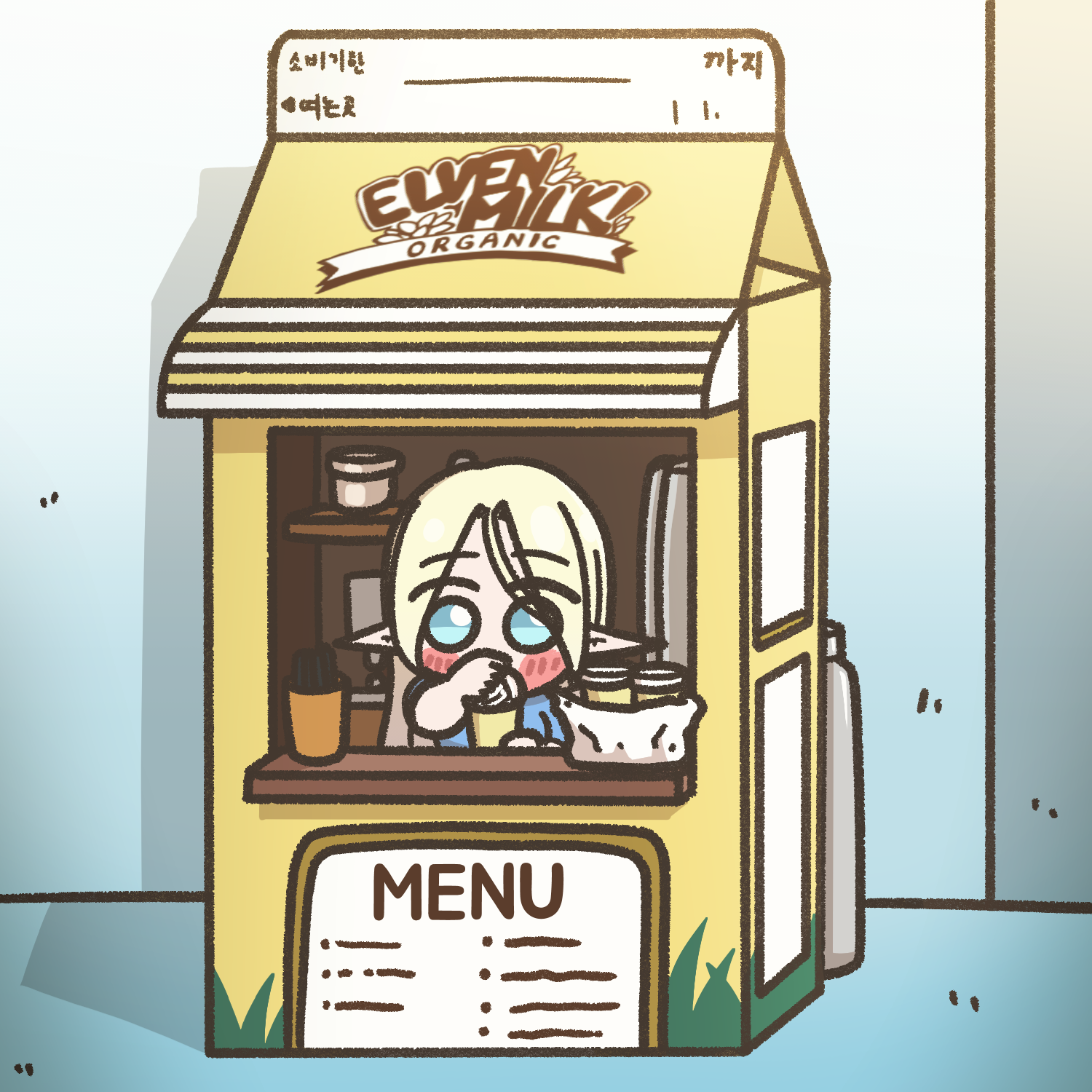 1girl alternate_costume bag blonde_hair blue_eyes blush_stickers bottle cerestia_of_life chibi chibi_only clooliss commentary_request cup disposable_cup drink_carton drinking_straw elf english_text highres korean_commentary last_origin long_hair market_stall menu milk_bottle milk_carton plastic_bag pointy_ears refrigerator security_shutter shirt solo very_long_hair