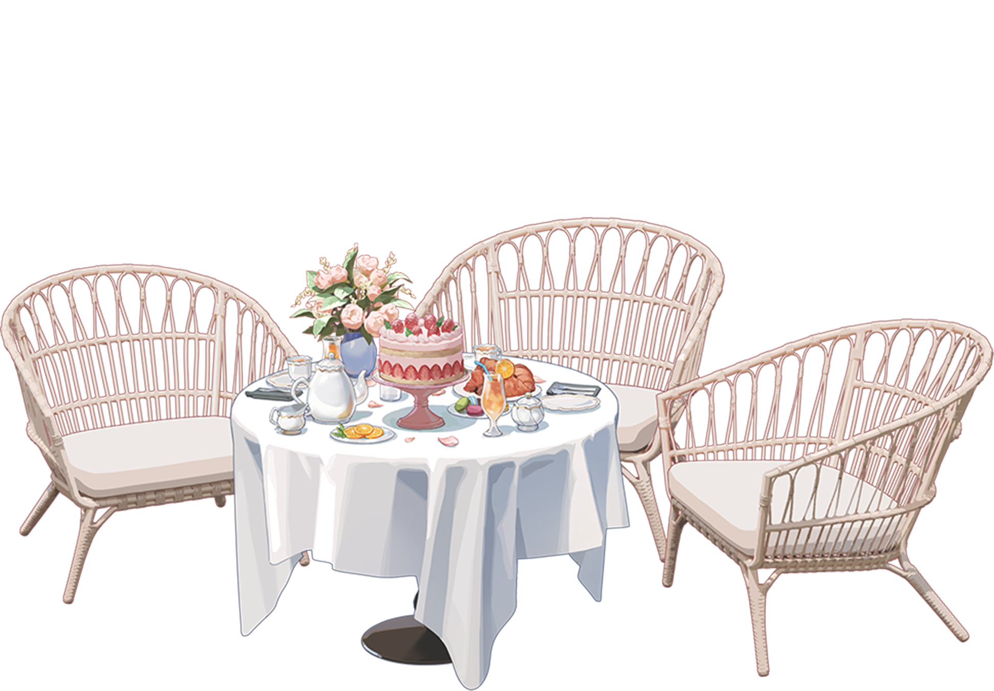 blue_archive cake chair cup cushion drink drinking_straw flower food fork fruit highres macaron napkin official_art orange_(fruit) plate simple_background spoon table tagme tea teacup teapot transparent_background vase