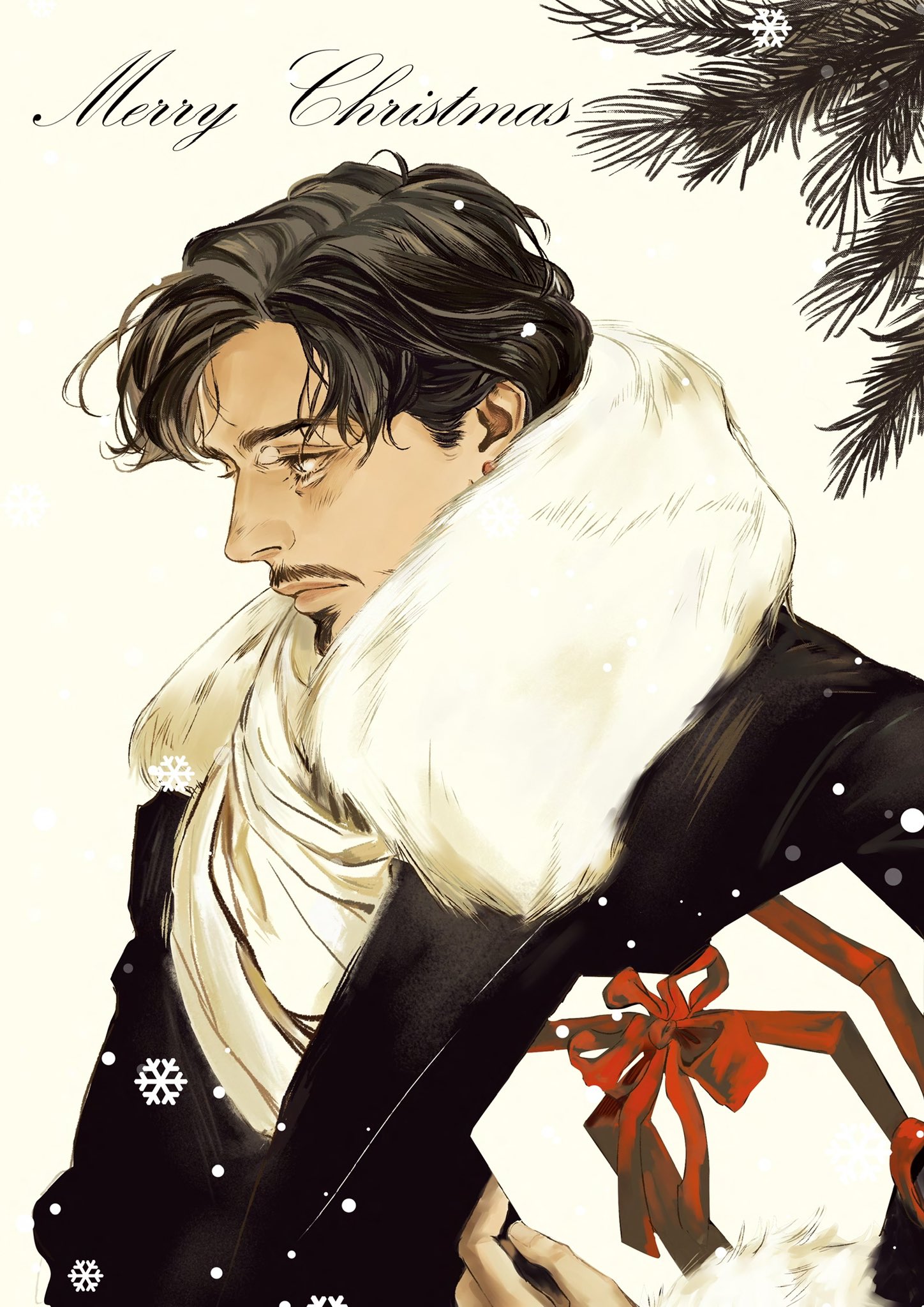 1boy black_coat box coat commentary english_commentary fur_trim gift gift_box highres holding holding_gift iron_man_(series) male_focus malkogromit marvel merry_christmas parted_hair shirt simple_background solo tony_stark upper_body white_background white_fur white_shirt