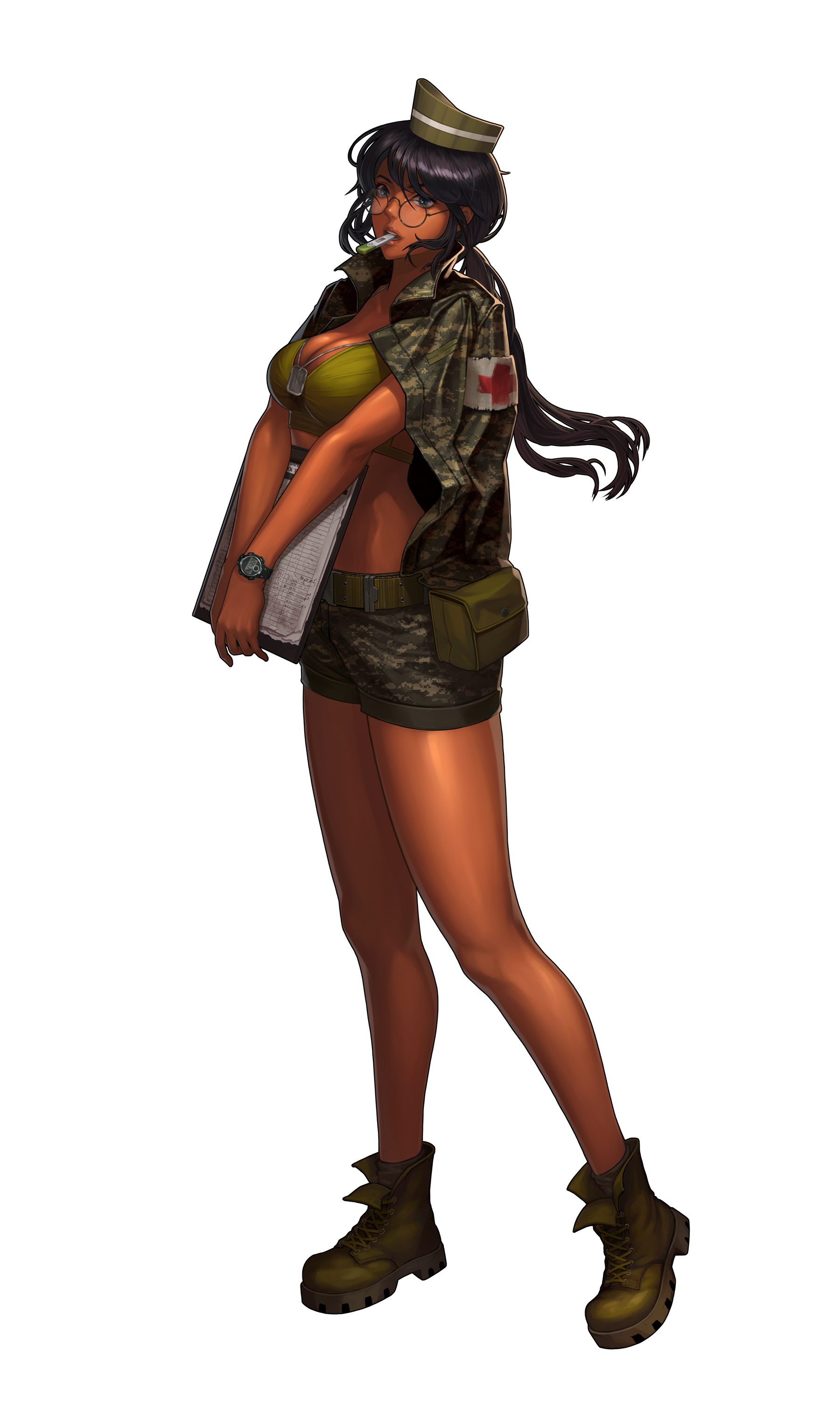1girl absurdres artist_request belt black_hair black_survival blue_eyes boots breasts camouflage camouflage_jacket camouflage_shorts cathy_huggins cathy_huggins_(combat_medic) cleavage clipboard combat_boots combat_medic commentary dark-skinned_female dark_skin digital_thermometer dog_tags english_commentary glasses hat highres holding holding_clipboard jacket official_art ponytail red_cross_armband shorts solo thermometer thermometer_in_mouth third-party_source transparent_background watch wristwatch
