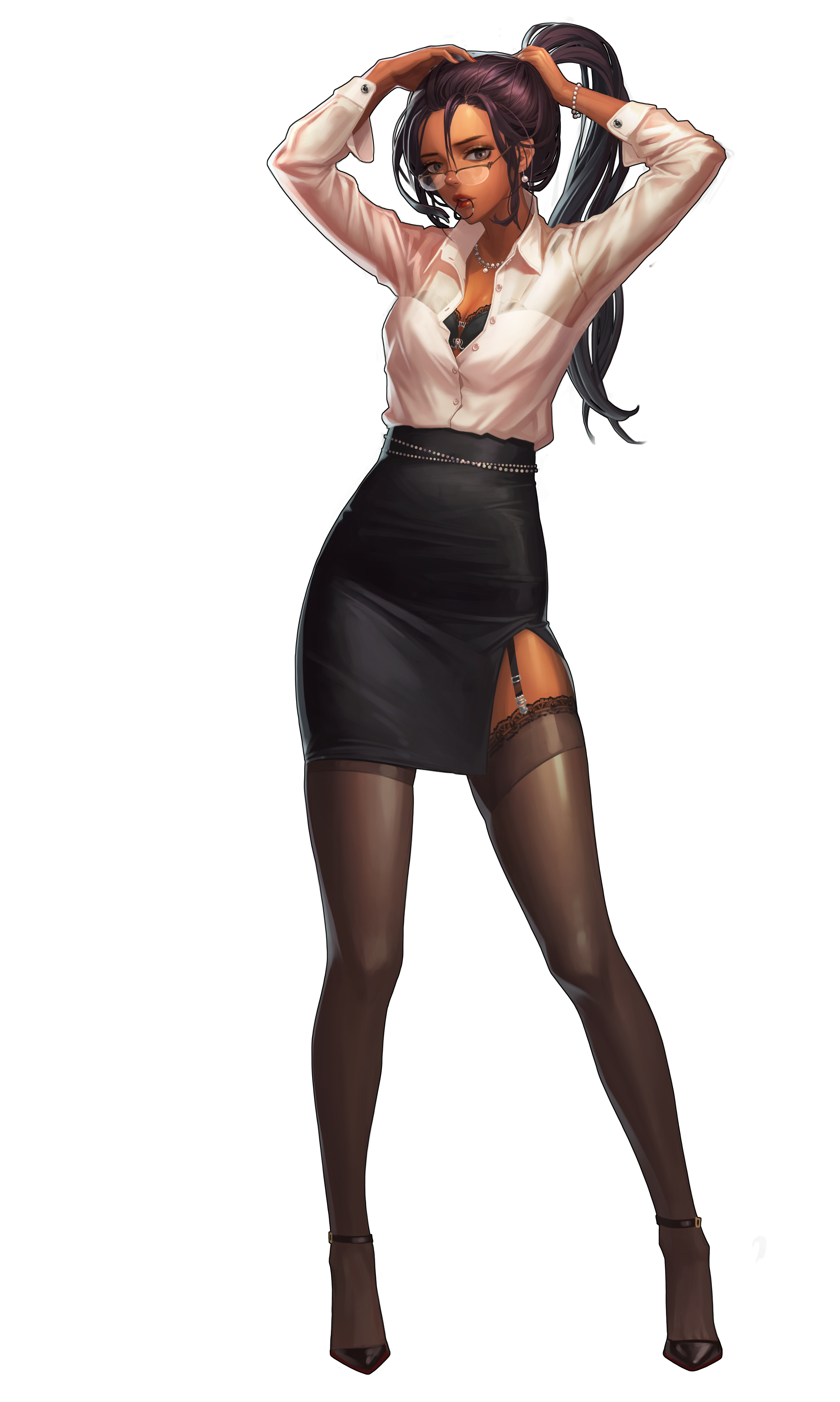 1girl absurdres artist_request black_hair black_survival bra bracelet breasts cathy_huggins cleavage commentary earrings english_commentary glasses grey_eyes hair_tie_in_mouth highres jewelry mouth_hold necklace official_art pearl_bracelet pearl_earrings pearl_necklace ponytail skirt solo standing thighhighs third-party_source transparent_background underwear