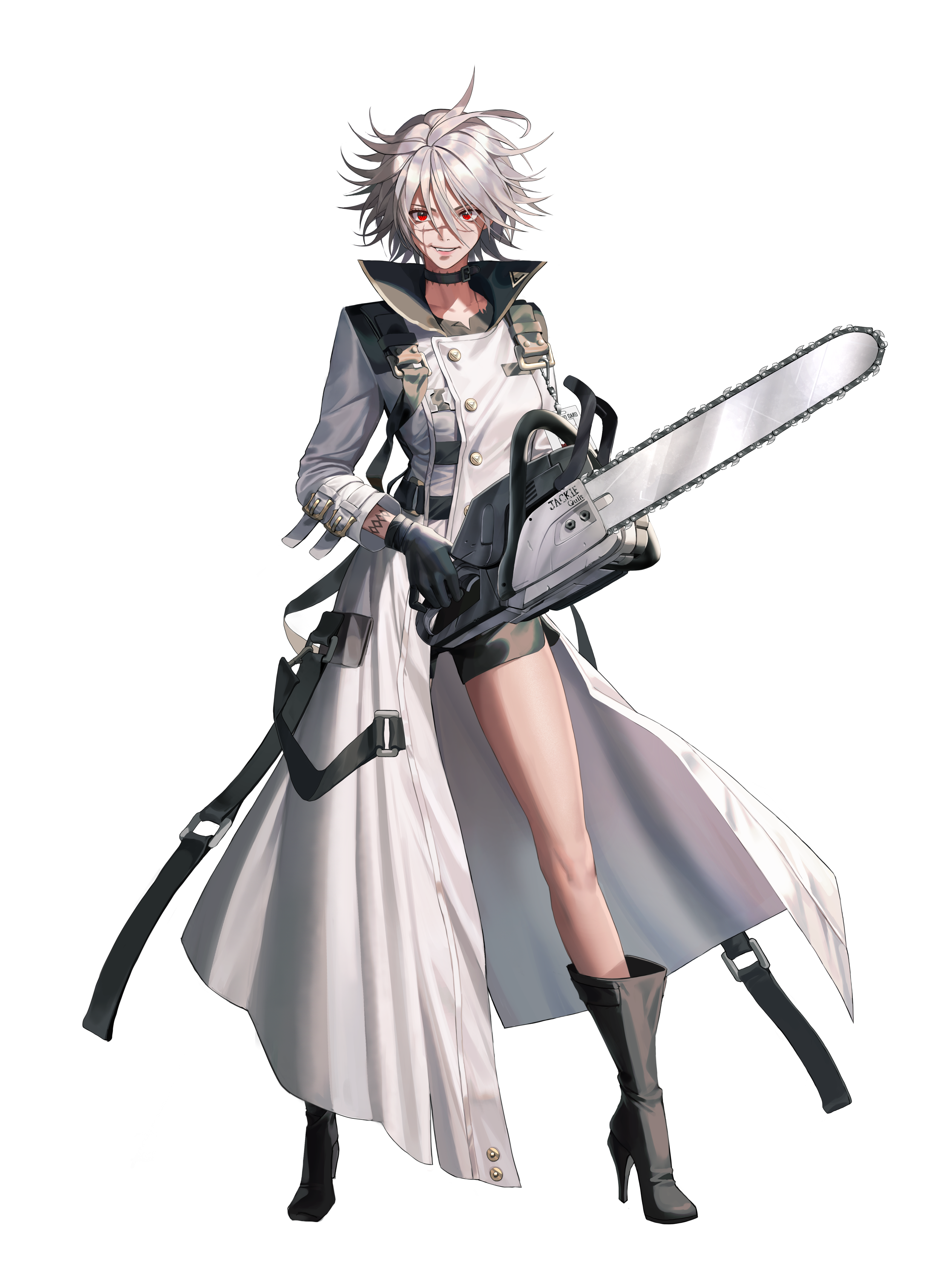 1girl absurdres artist_request black_gloves black_survival boots chainsaw coat commentary english_commentary gloves grey_hair grin hair_between_eyes high_heel_boots high_heels highres holding holding_chainsaw jackie_quilt official_art red_eyes scar scar_on_face scar_on_nose smile solo standing third-party_source transparent_background white_coat