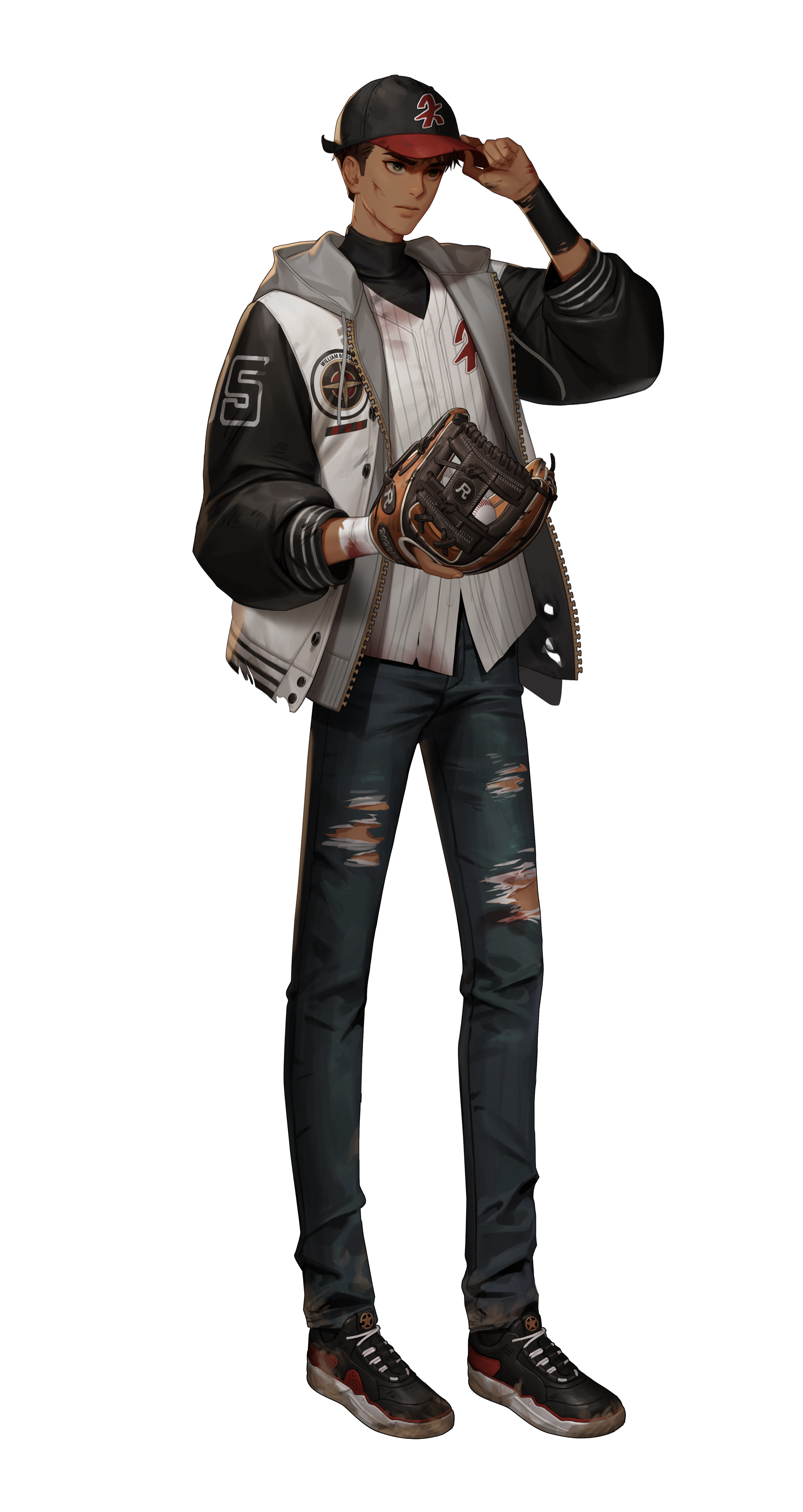 1boy absurdres artist_request ball bandaged_wrist bandages baseball_(object) baseball_cap baseball_glove black_survival blood blood_on_clothes blood_on_face bloody_bandages brown_hair commentary denim english_commentary green_eyes hat highres jacket jeans official_art pants solo standing third-party_source torn_clothes torn_jeans torn_pants transparent_background william_benson