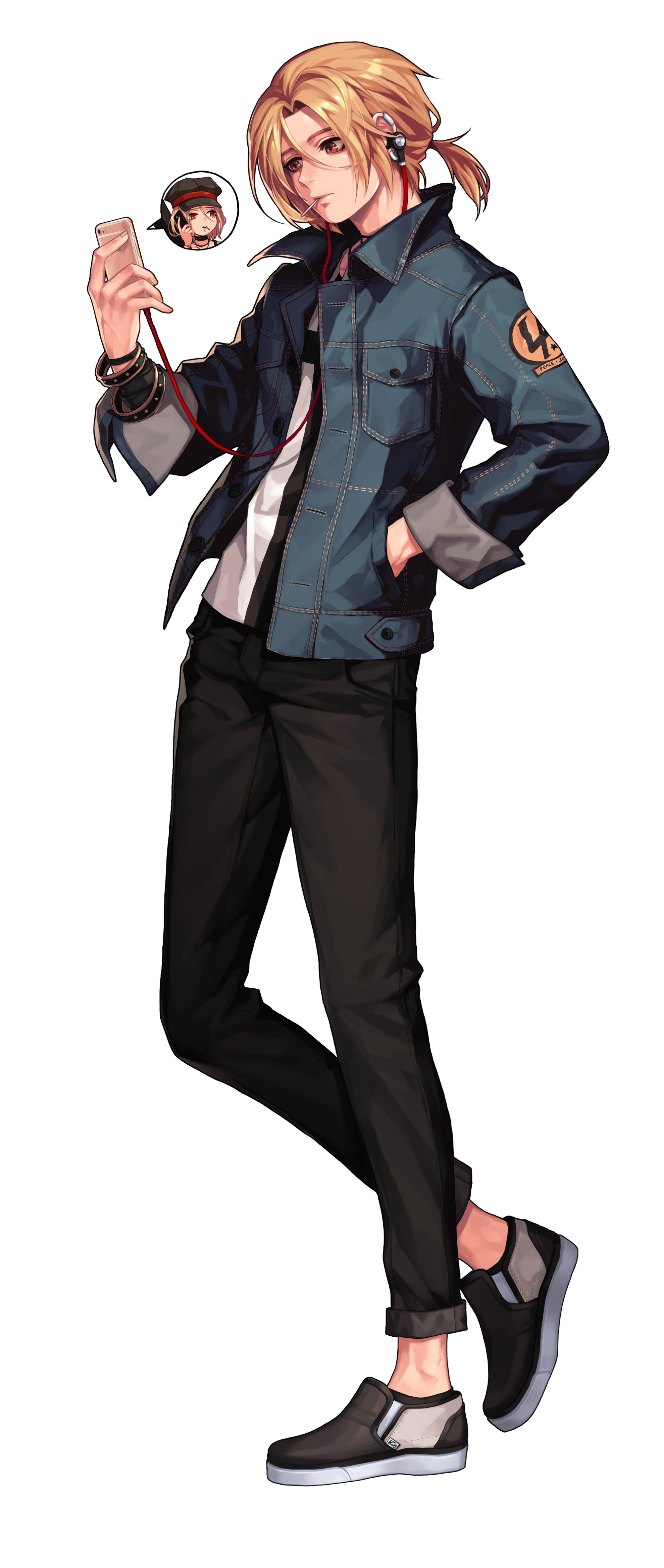 1boy absurdres artist_request black_pants black_survival blonde_hair brown_eyes cellphone clever_floyd commentary denim denim_jacket earbuds earphones earrings english_commentary hand_in_pocket hart_floyd highres holding holding_phone jacket jewelry official_art pants phone solo speech_bubble spoken_character third-party_source transparent_background