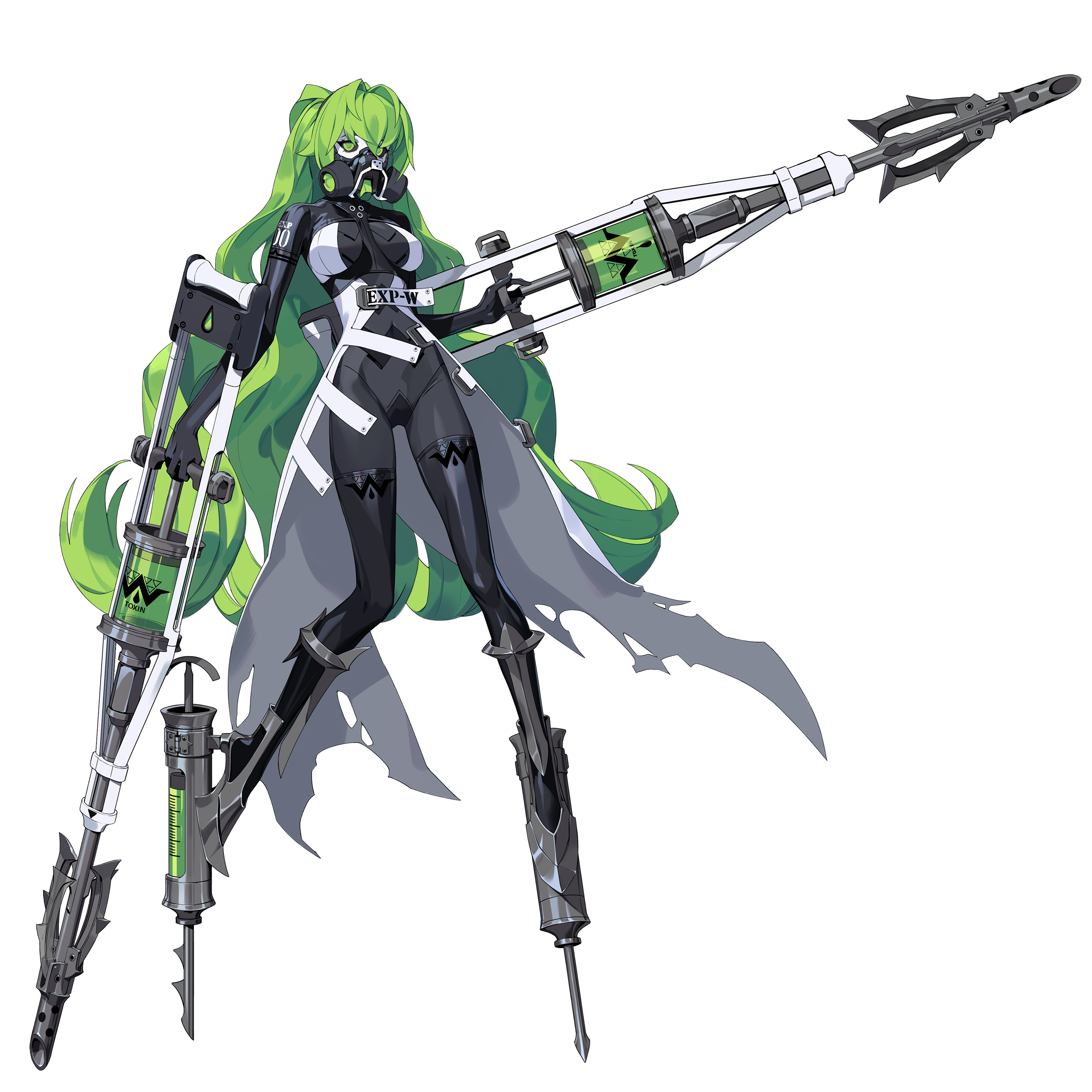 1girl absurdres android artist_request black_survival breasts colored_sclera crutch dr._wickeline eternal_return:_black_survival gas_mask green_eyes green_hair green_sclera highres lab_coat long_hair mask official_art robot solo syringe third-party_source torn_clothes torn_coat transparent_background